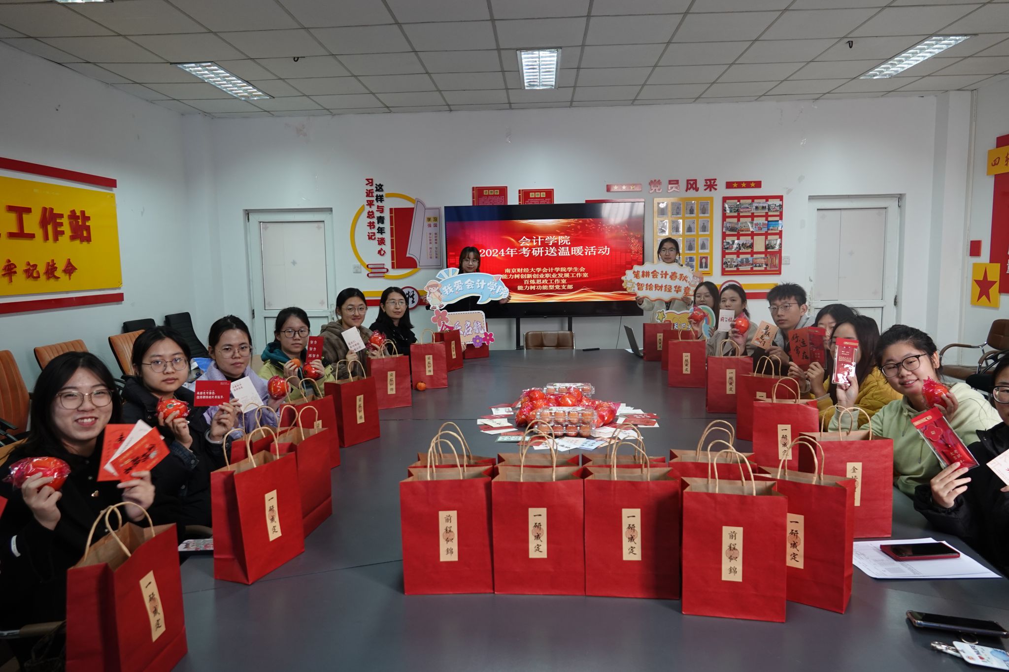 会计学院为考研学子送上贴心的考研“加油包”,有精美的“一研为定”定制福袋和祝福挂件,寓意“脐”开得胜、“橙”功上岸、心想“柿”成的福柿与橙子,还有承载着老师们、学弟学妹们真切祝福的小卡片,饱含学院对考研学子在考试中一举夺魁、一战成“硕”的美好祝福与期盼。