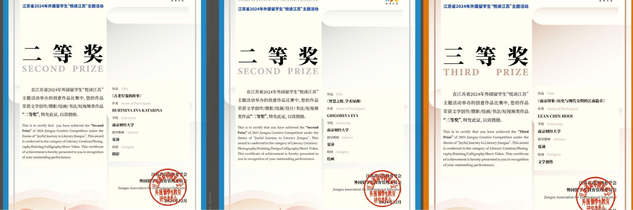 在由江苏省教育厅、江苏省高等教育学会外国留学生教育管理委员会联合举办的“悦读江苏”主题活动中,bat365留学生凭借独特的创意、精湛的技艺和深厚的文化底蕴,获二等奖2项、三等奖1项,1名留学生获聘“我是说‘苏’人”。俄罗斯留学生、视觉传达设计2301班BURTSEVA EVA KATARINA(伊娃)的摄影作品《古老灯笼的故事》获二等奖。她以细腻的镜头捕捉了江苏传统灯笼的独特韵味,通过光影的巧妙运用,展现了灯笼背后的文化故事和历史变迁。俄罗斯留学生、动画2401班GRIGOREVA EVA(前苒夕)的绘画作品《智慧之殿、学术绿洲》获二等奖。该作品以校图书馆为创作灵感,将学校的学术氛围和优美环境融为一体,通过细腻的笔触和丰富的色彩,呈现出一幅充满智慧与活力的校园画卷,展示了学校的独特魅力。在文学作品方面,马来西亚留学生、电子商务2101班LEAN CHIN HOOI(练靖慧)的作品《南京印象:历史与现代交织的江南篇章》获三等奖。她以南京为背景,通过生动的笔触和细腻的情感,描绘了这座城市的历史变迁与现代风貌,表达了她对这座城市的深厚情感。泰国留学生、国际经济与贸易2302班SRISOMKAEW MISS SIRIPORN(张诗丽)被聘为“我是说‘苏’人”。作为“悦读江苏”主题的相关推广人员,她将承担起宣传江苏文化、推广江苏形象的重要任务,为增进中外文化交流贡献力量。