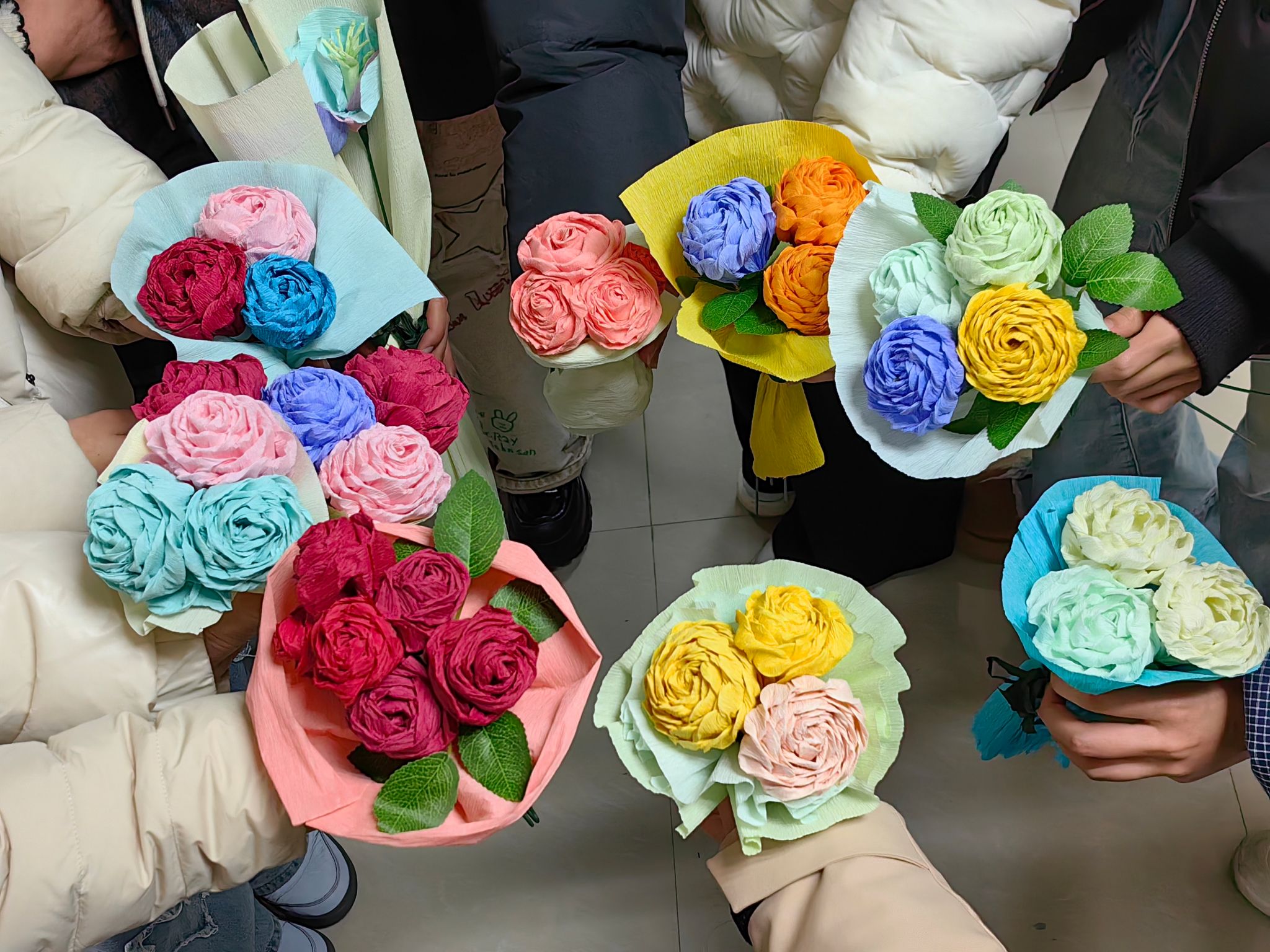 梅西学院学生制作玫瑰花,随着一朵朵精美的玫瑰花在手中绽放,志愿者们将这些凝聚着爱与祝福的花朵送到了学院女老师手中,并向她们致以节日问候。