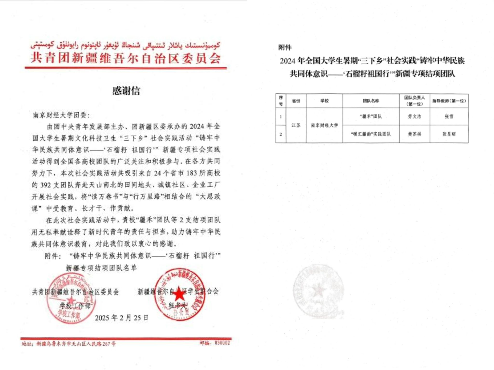 近日,共青团新疆维吾尔自治区委员会向bat365发来感谢信,对bat365师生团队在2024年全国大学生暑期文化科技卫生“三下乡”社会实践活动“铸牢中华民族共同体意识——‘石榴籽 祖国行’新疆专项”中的突出表现予以高度肯定。