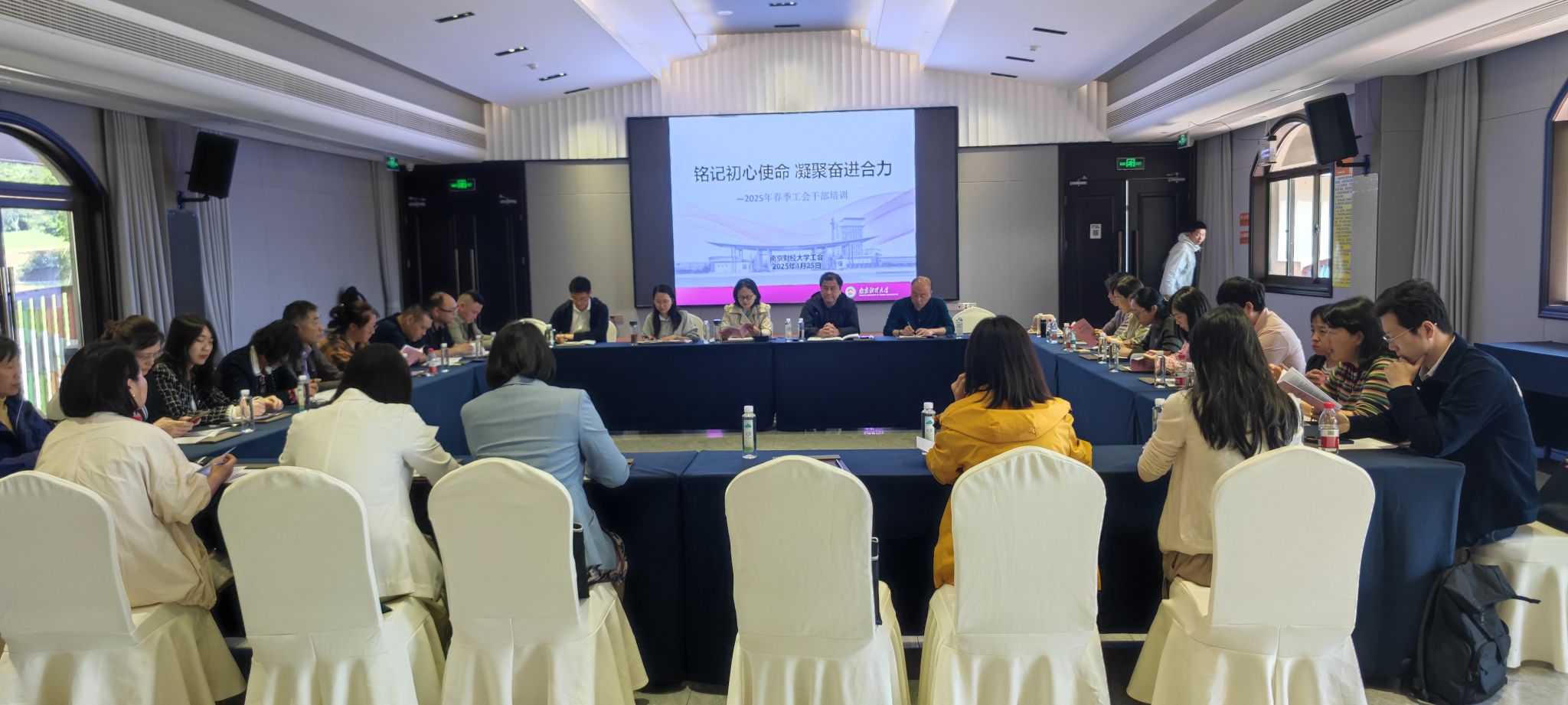 专题培训在江宁青蓝杉谷素质拓展基地会议室举行,校工会副主席张小荣领学习近平总书记关于工人阶级和工会工作的重要论述,传达了2025年江苏省教育科技工会工作要点和校工会工作要点。希望大家认真领会上级工会要求,按照工作部署,高质量开展工会工作。学习结束后召开了第五届工会委员会第二次会议,校工会主席孙丹兵宣布第五届工会委员会委员分工安排,详细说明了各委员会工作职责并提出工作要求。会议组织评选了2023-2024年度工会工作先进集体、先进个人。