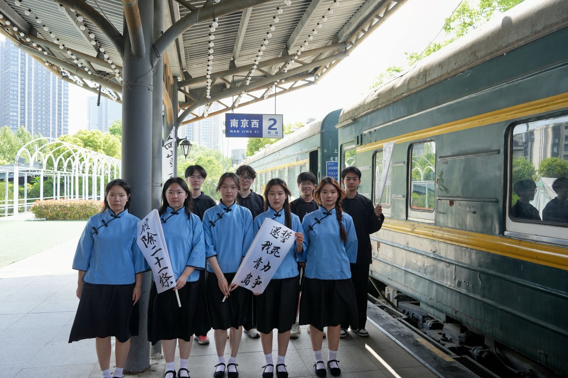 梅西学院学子通过重走革命故地、再现历史场景,身临其境感受历史,深刻理解五四精神内涵,汲取奋进力量。在下关火车公园,同学们回顾了1919年那场波澜壮阔的学生运动,再现了“爱国觉醒”;在河海大学(西康路校区)张闻天广场,重温了五四时期进步青年追求真理、投身革命的壮志豪情;在渡江胜利纪念馆,见证五四运动以来,青年从思想启蒙、街头抗争到投身革命、推动胜利的完整历史脉络;在学校图书馆前,同学们面向镜头高声宣言,展现新时代青年的责任与担当。