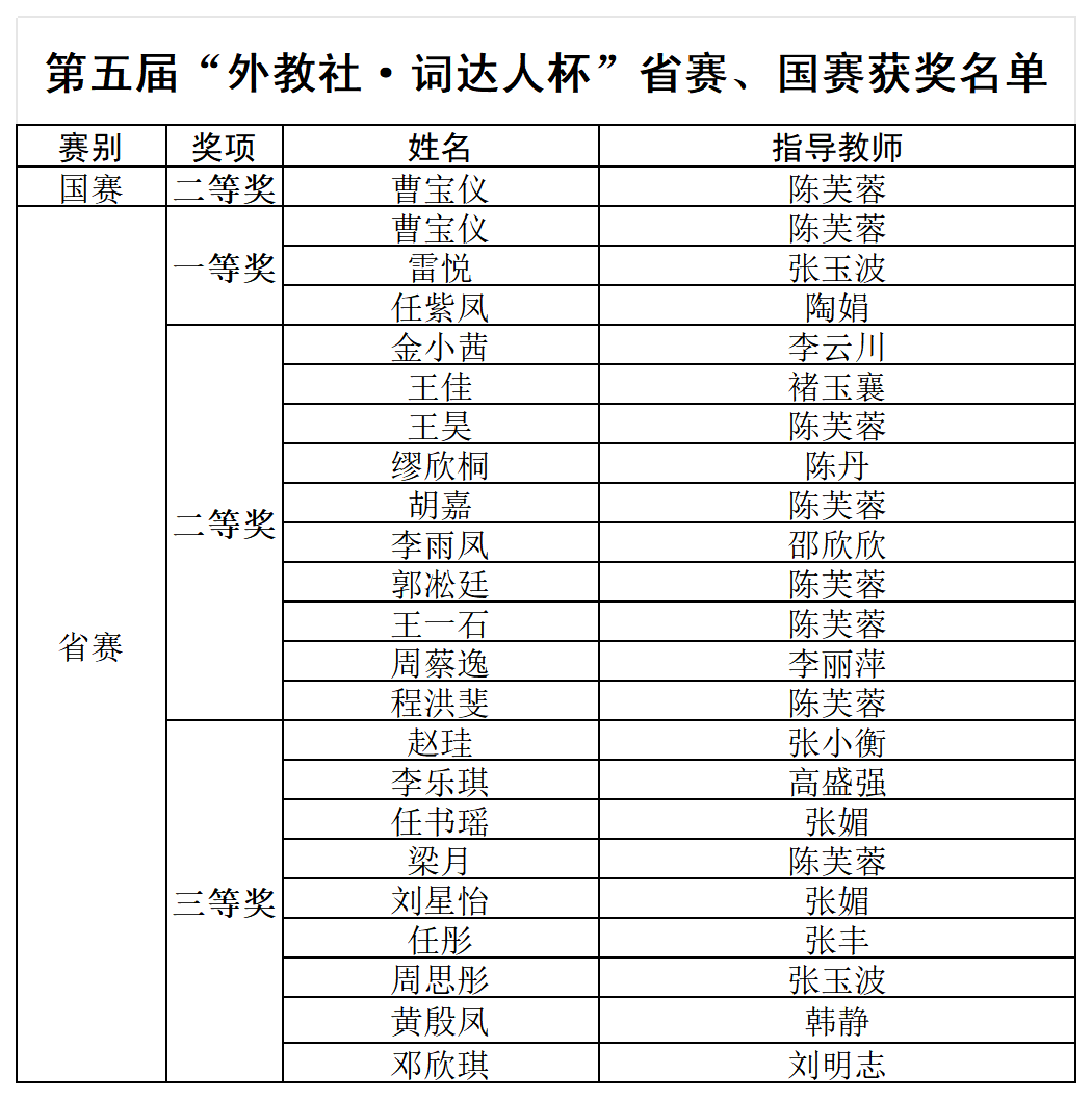 近日,第五届“外教社·词达人杯”全国大学生英语词汇能力大赛落下帷幕,来自全国1635所院校共计2095位学生参赛,经过激烈角逐,bat365营销2023级曹宝仪同学荣获全国二等奖。