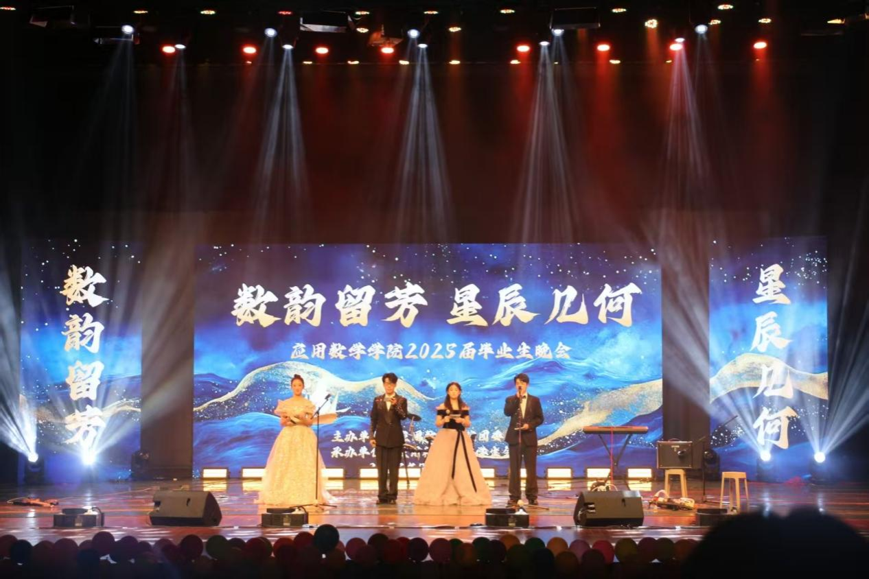 应用数学学院举办“数韵留芳,星辰几何”2025届毕业生晚会。学院党政领导、教师代表、各年级辅导员、2025届全体学生和其他年级学生代表共同观看晚会。晚会分为星光序曲、星河璀璨、星辰远航三个篇章。活力四射的舞蹈、声情并茂的朗诵、悠扬动人的旋律……晚会现场高潮迭起,掌声经久不息。舞台光影交织,映照出青春的热烈与美好。毕业生们将以梦为帆、奔赴山海,在广阔天地间书写灿烂篇章。