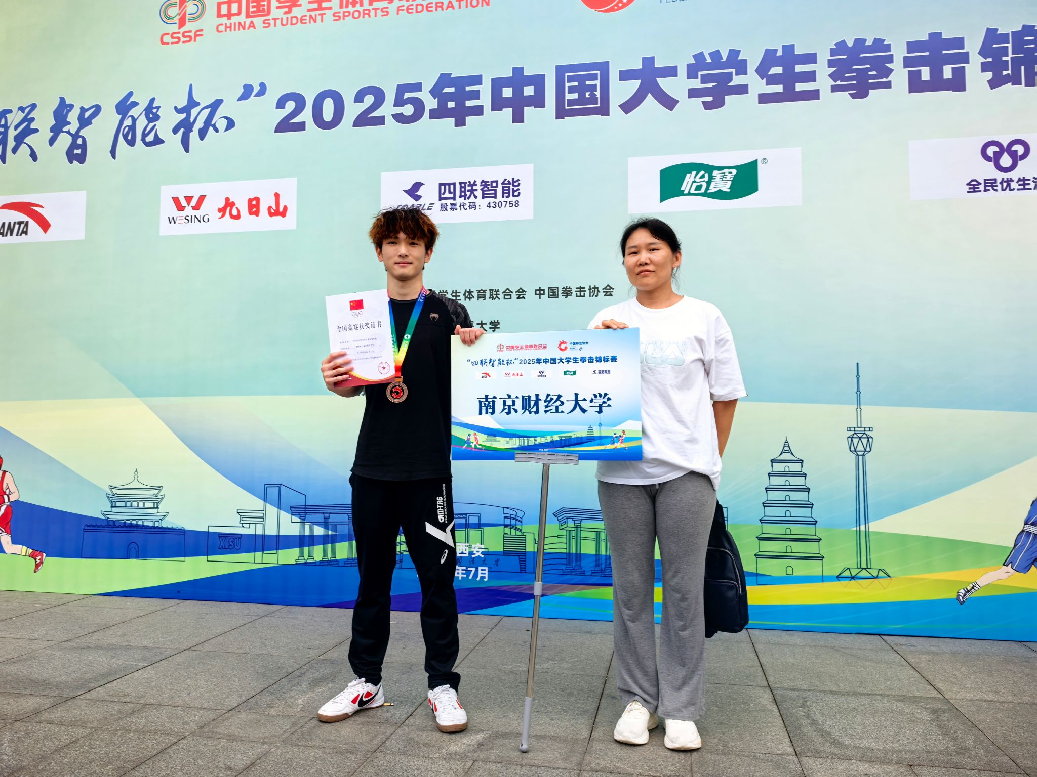 7月20日,2025年中国大学生拳击锦标赛在西安外国语大学落幕,bat365网络与新媒体专业2401班廖麒麟同学斩获男子甲组55公斤级季军。