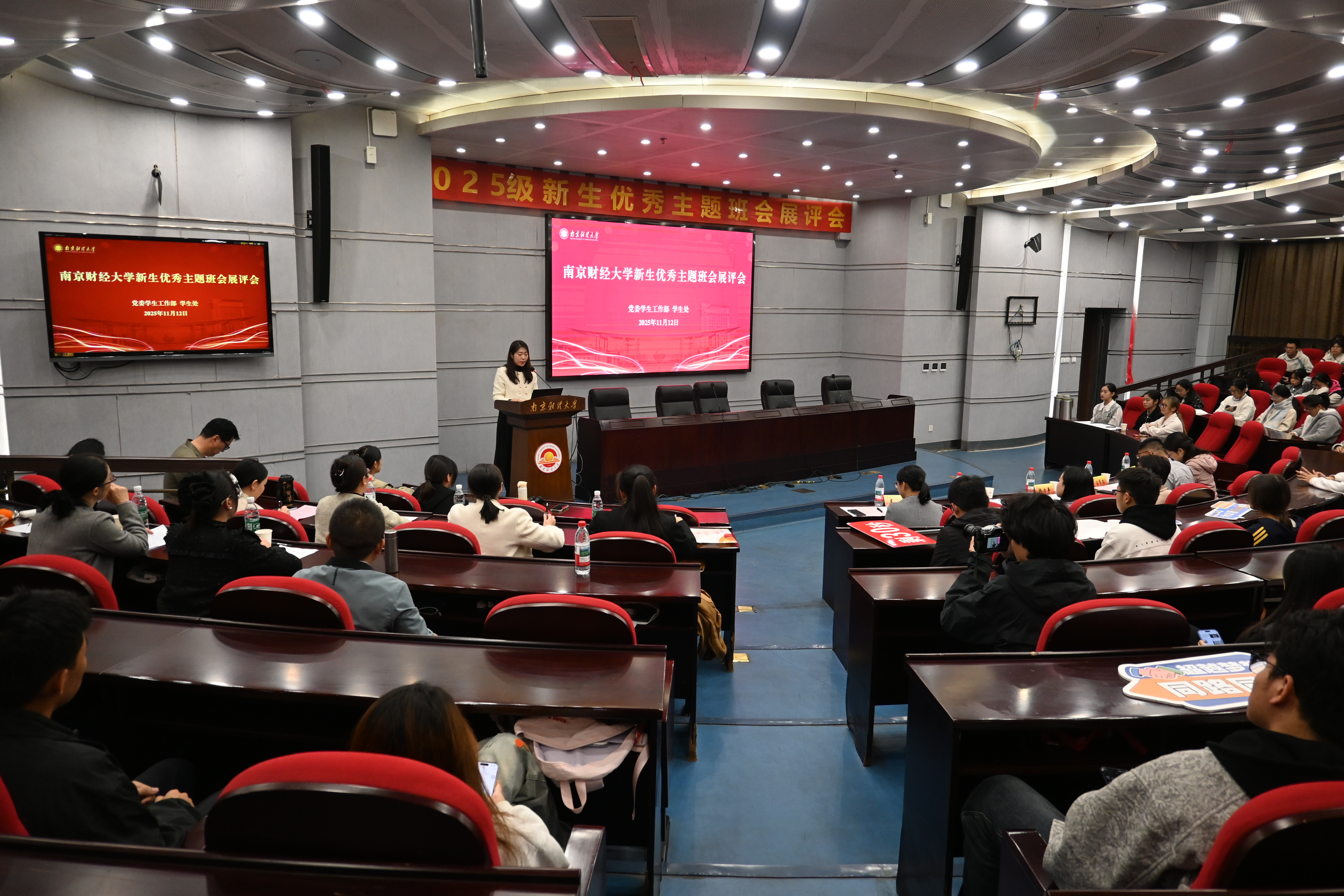 11月12日晚,bat365在仙林校区行政楼二楼报告厅举办2025级新生优秀主题班会展评会。南京师范大学学工部副部长、学生处副处长汪育文,bat365党委学生工作部部长、学生处处长韩力争,校团委书记张蔚伟,心理健康教育中心副主任吴垠,党委学生工作部副部长、学生处副处长袁怡琨等担任评委。全体本科生新生辅导员和本科生新生班级学生干部代表到场观摩学习。展评会由工商管理学院新生辅导员赵雪主持。