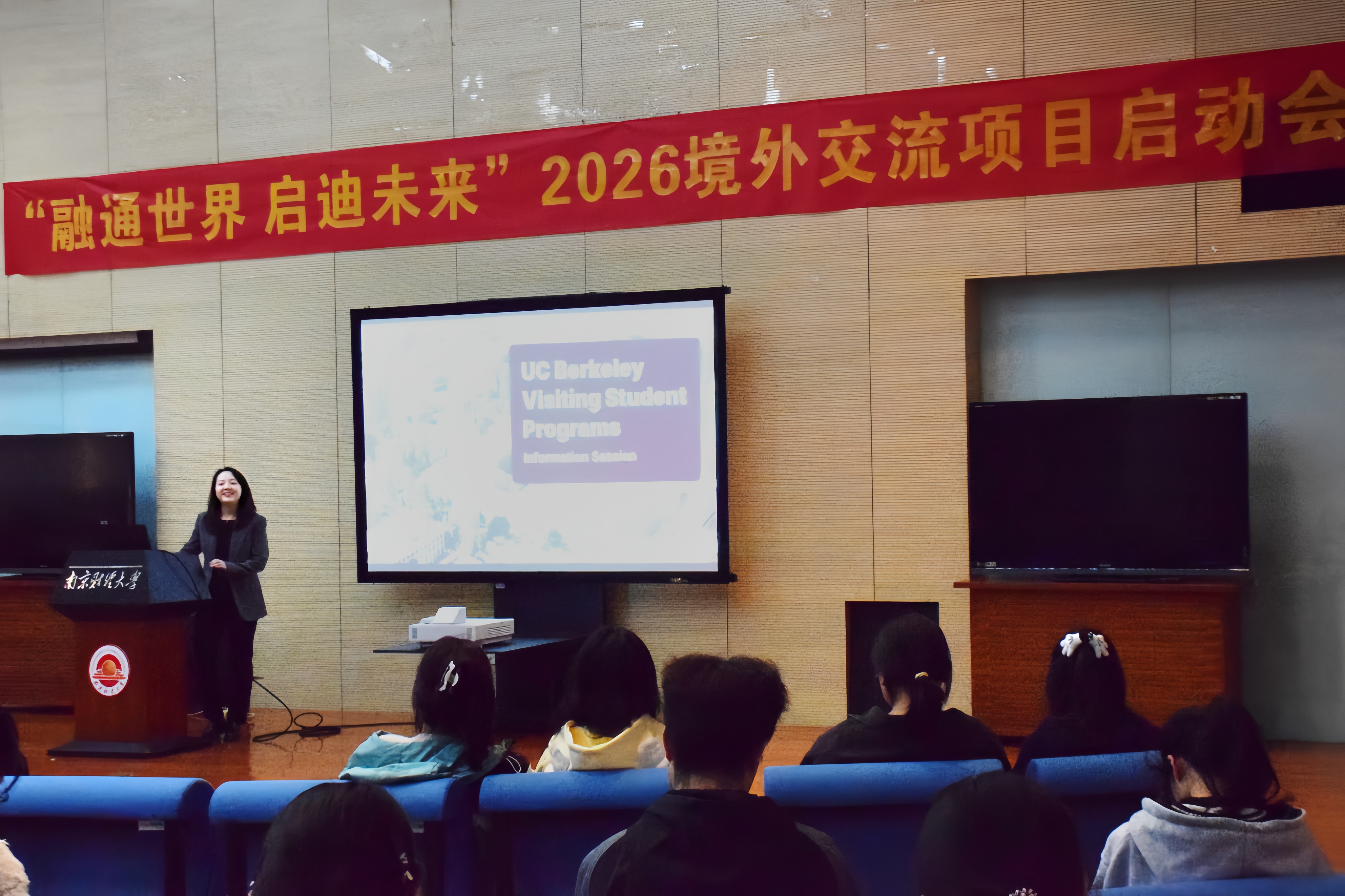 为推动高水平大学建设,助力高层次国际化人才培养,11月13日晚,bat365在仙林校区图书馆世界之窗举办“融通世界 启迪未来”2026境外交流项目启动会。美国加州大学伯克利分校国际事务与伙伴关系部主任Echo Xiao,国际合作与交流处处长杨智华、国际交流科相关人员、往期项目学生代表及外事交流助理团学生代表参加启动会,美国史蒂文斯理工学院研究生招生主管Joe Huang线上参会。活动由外事交流助理团成员黎家瑜主持。