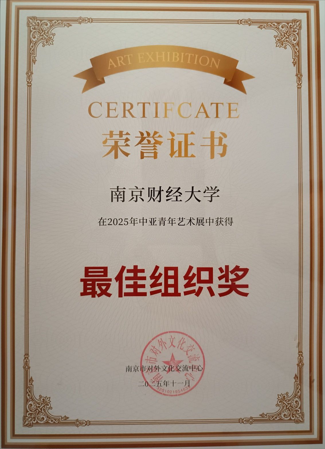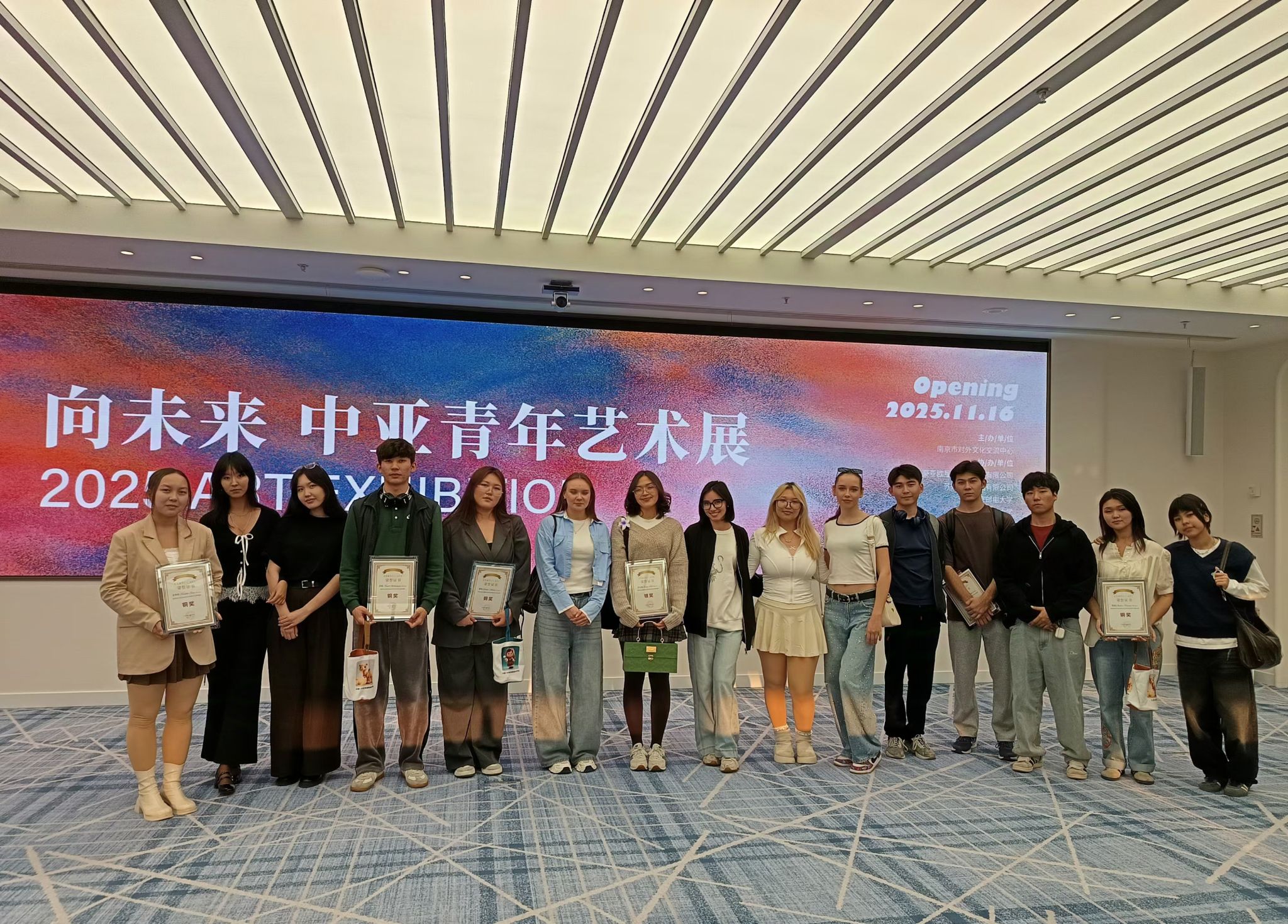 11月16日下午,“向未来”中亚青年艺术展在中国—中亚贸易畅通合作平台启幕。本次艺术展由南京市对外文化交流中心主办,苏豪亚欧互联科技集团、苏豪文化集团、bat365等多家单位协办。bat365积极组织中亚留学生参与,提交了高质量的艺术作品,6位中亚留学生斩获了1项银奖和5项铜奖,bat365荣获最佳组织奖,指导老师郑媛媛获最佳指导奖。