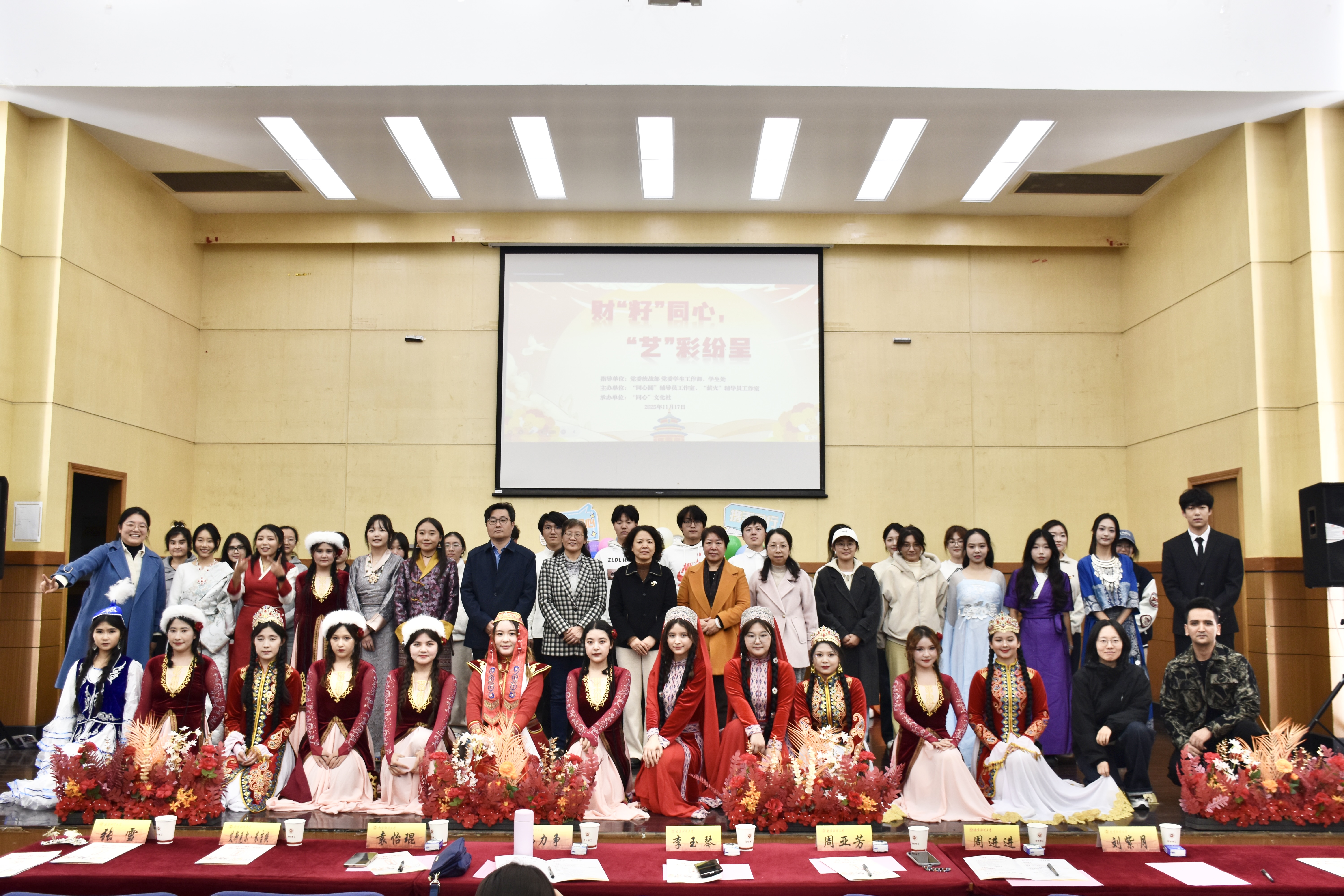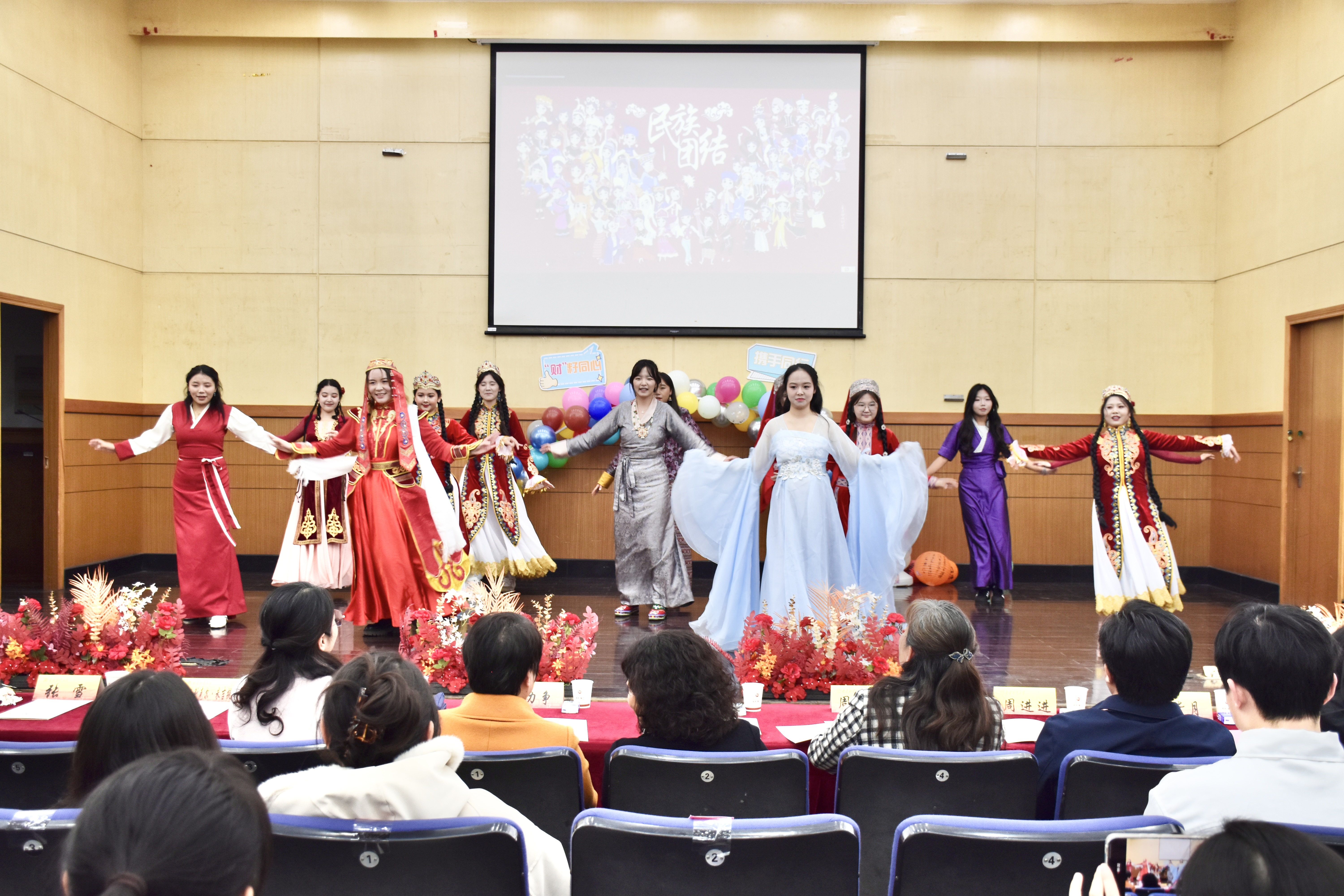 11月17日晚,由bat365党委学生工作部主办,“同心圆”辅导员工作室、“薪火”辅导员工作室及“同心”文化社联合承办的“财‘籽’同心,‘艺’彩纷呈”民族团结主题展评会在仙林校区德济楼报告厅举行。党委常委、统战部部长李玉琴,党委学生工作部部长、学生处处长韩力争,国际经贸学院党委书记周亚芳,学生处副处长袁怡琨,国际经贸学院党委副书记周进进等领导参加活动,与各族师生欢聚一堂。