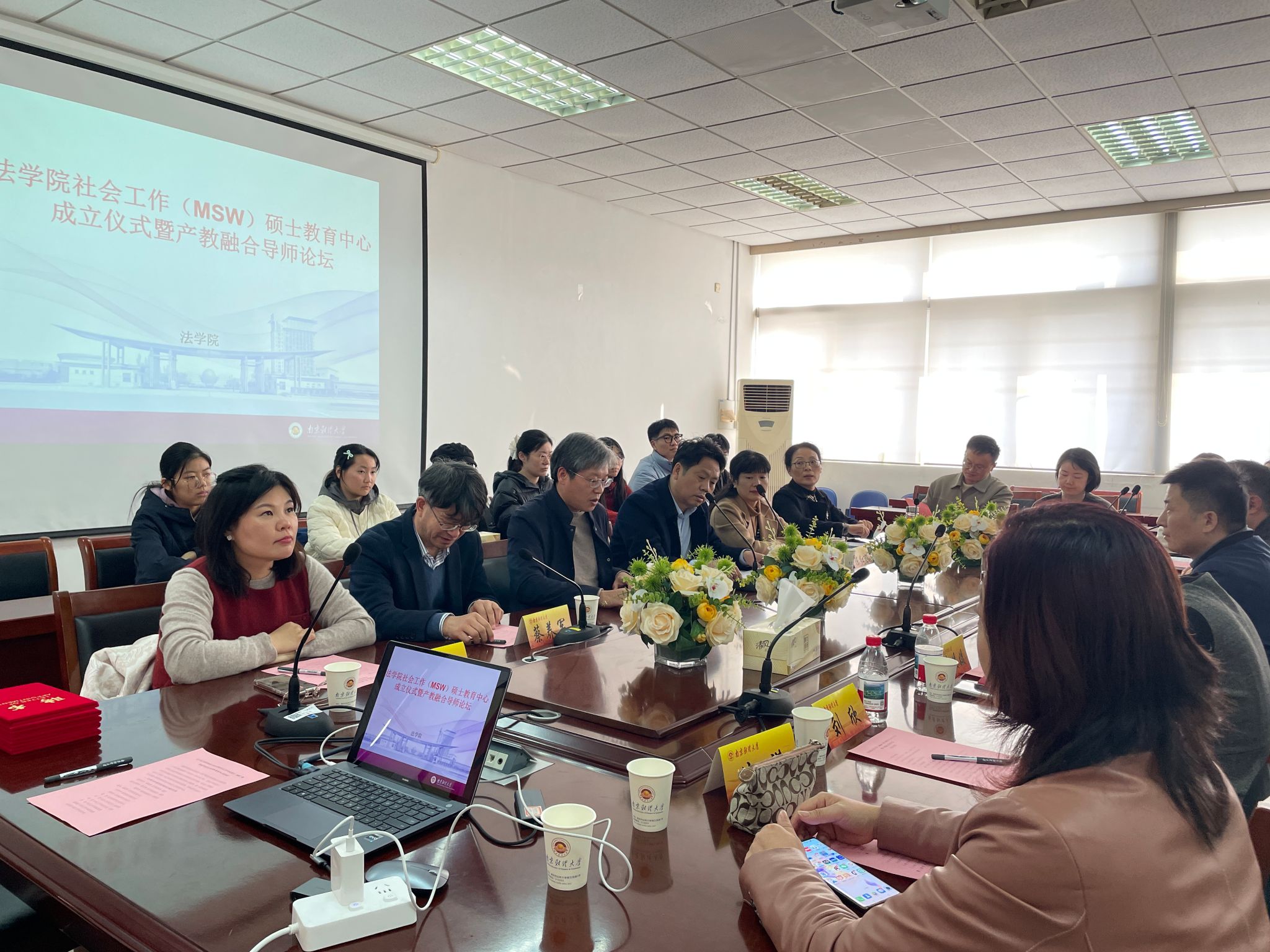12月10日下午,法学院社会工作(MSW)硕士教育中心成立仪式暨产教融合导师论坛在仙林校区德正楼404会议室举行。南京市栖霞区启蒙社区发展中心理事长岳耀蒙、南京同心未成年人保护和服务中心总干事高娟娟、南京市救助站高级社会工作师刘欣、南京市益民社会服务中心理事长姜媛媛、南京市溧水区英博社会工作服务中心理事长王合涛等行业专家,法学院领导、社会工作系全体教师、研究生及部分本科生代表参加活动。活动由法学院党委书记黄建国主持。