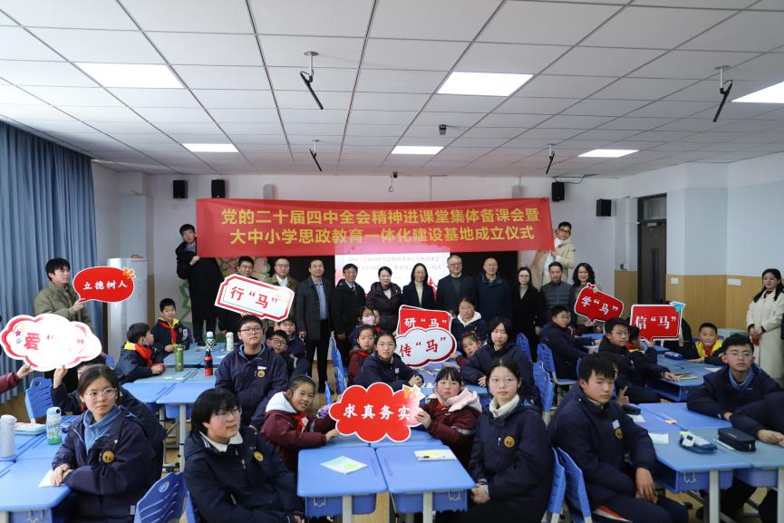 为将党的二十届四中全会精神融入思政课教学,深入推动党的创新理论进教材、进课堂、进头脑,1月9日,党的二十届四中全会精神进课堂集体备课会暨大中小学思政教育一体化建设基地成立仪式在南京仙林外国语学校华侨城中学举办。活动由党委宣传部与马克思主义学院,联合中共南京市栖霞区委宣传部、仙外华侨城中学、仙外华侨城小学共同举办。主承办单位相关领导、师生代表参加活动。
