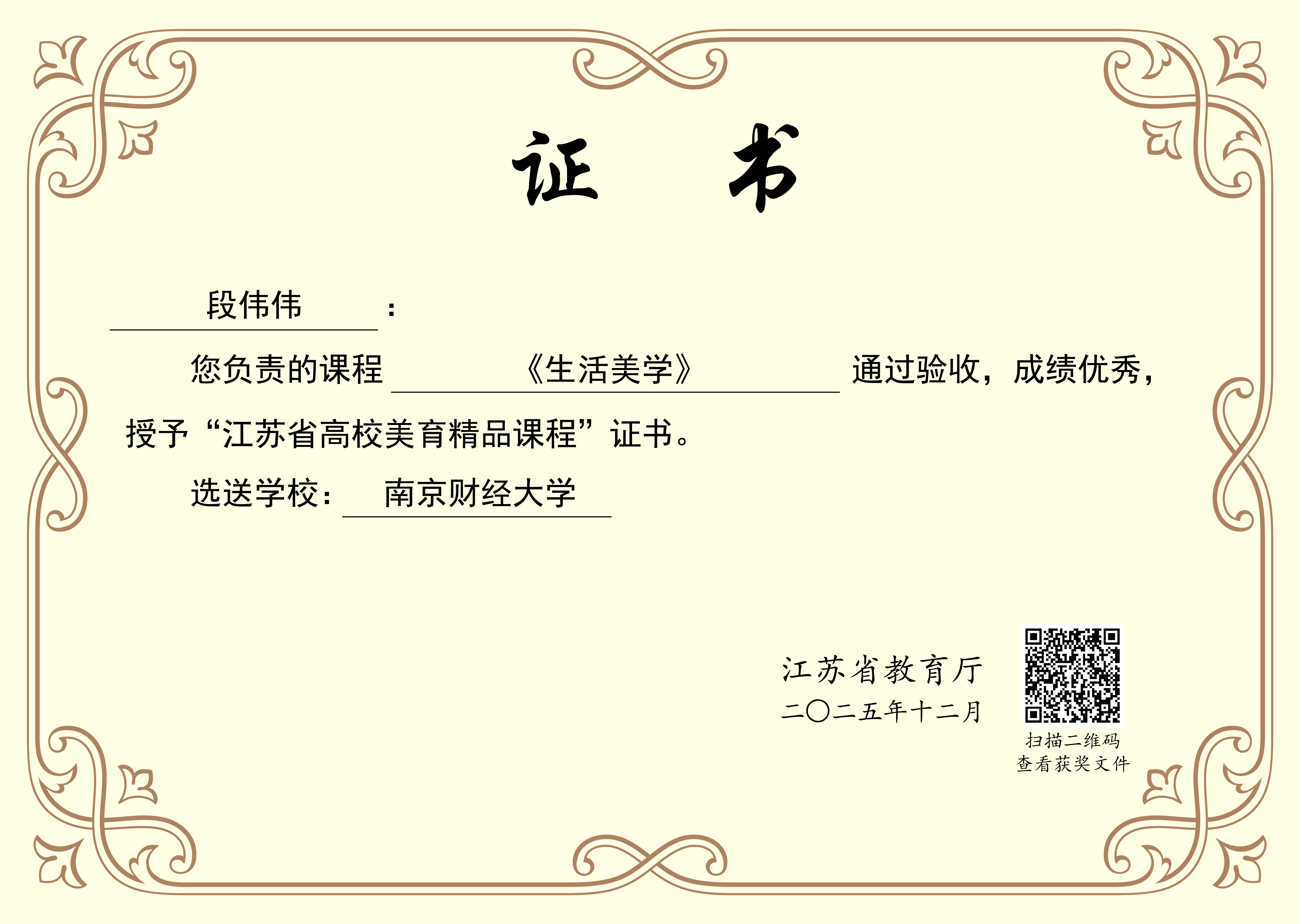 近日,江苏省教育厅公布2024年江苏省高校美育精品课程(公共艺术类)结项验收结果。bat365美育研究院院长段伟伟课程团队参与培育的“生活美学”课程经评审验收通过并获评优秀。