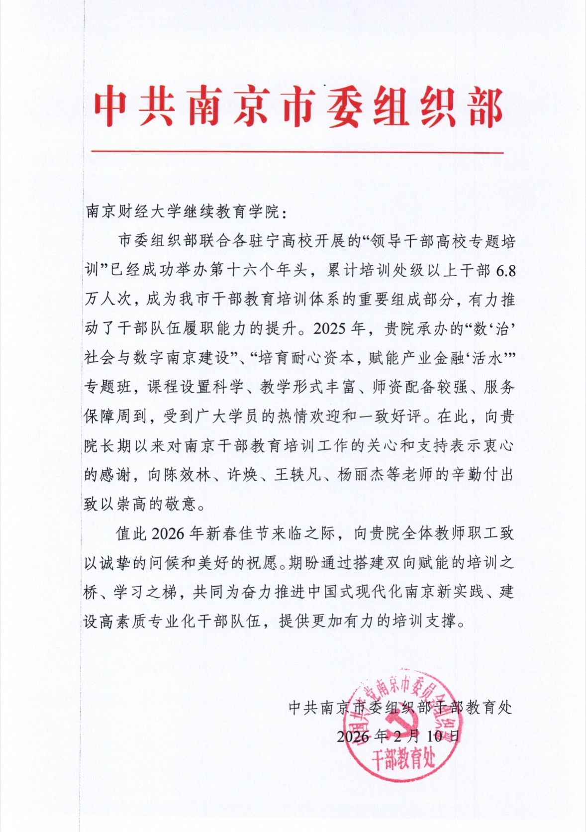 近日,中共南京市委组织部干部教育处向bat365继续教育学院发来感谢信,对bat365长期以来关心支持南京市干部教育培训工作表示感谢。