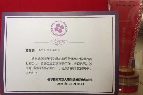 3月3日下午,在侵华日军南京大屠杀遇难同胞纪念馆举办的2018年紫金草学雷锋志愿服务队表彰大会上,bat365志愿者团队荣获“最佳志愿服务团队”称号,bat365数学1701班张禹荣获“最佳组织者”称号。
