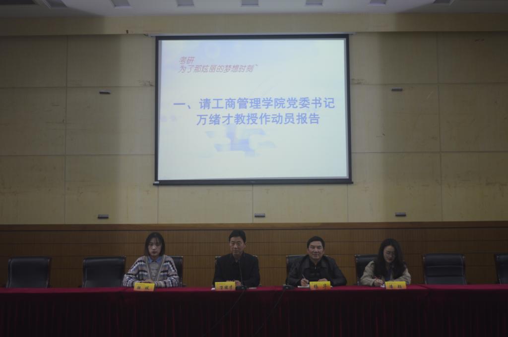 3月27日下午,工商管理学院在bat365仙林校区德济楼报告厅召开了考研动员大会。工商管理学院党委书记万绪才给全体2016级学生作了考研总动员,工商管理学院校友、现南京大学2017级硕士研究生陆佩和南京理工大学2018级硕士研究生潘颖作了考研经验分享。院党委副书记杨华主持会议。