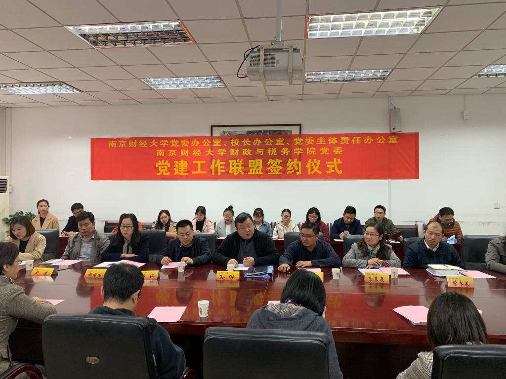 4月10日下午,党校办、财政与税务学院在仙林校区德经楼408会议室举行了党建联盟签约仪式。党委办公室、校长办公室、党委主体责任办公室班子全体成员、财政与税务学院班子全体成员、双方单位全体教工党员、财政与税务学院部分学生党员代表参加了签约仪式。