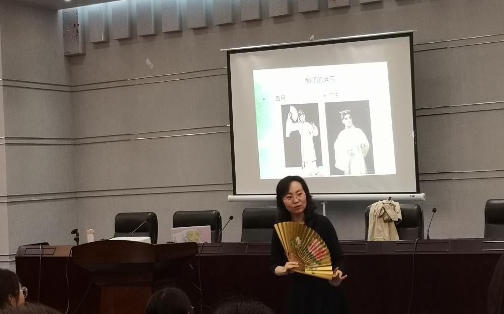 赵天为副教授以我国著名昆曲《牡丹亭》为切入点,引入昆曲主题,深刻剖析了《牡丹亭》作为一张中国戏曲名片的文化内涵与历史意义。她以传统昆曲《长生殿》《桃花扇》为例,详细介绍了昆曲的产生、发展、成熟、衰落和新生,并利用图片、视频和道具等多样形式生动形象地剖析了昆曲的特点。赵天为副教授将西方戏剧和中国戏剧对比,通过分析两者的异同强调昆曲的独特和经久不衰的生命力。赵天为副教授还亲自示范了昆剧动作,优美典雅、充满古韵味道的动作赢得了满座掌声。