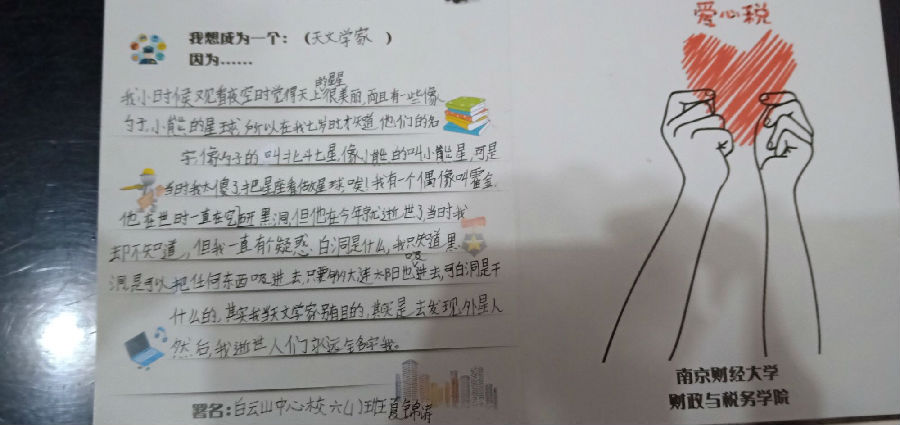 近日,由财税学院捐资成立的“四方书角”在贵州黔南布依族苗族自治州长顺县白云山中心校建成,1170册女性青少年图书以及专为山区女童制作的“梦想职业卡片”,通过学院品牌公益项目“爱心税”寄达当地孩子们身边。