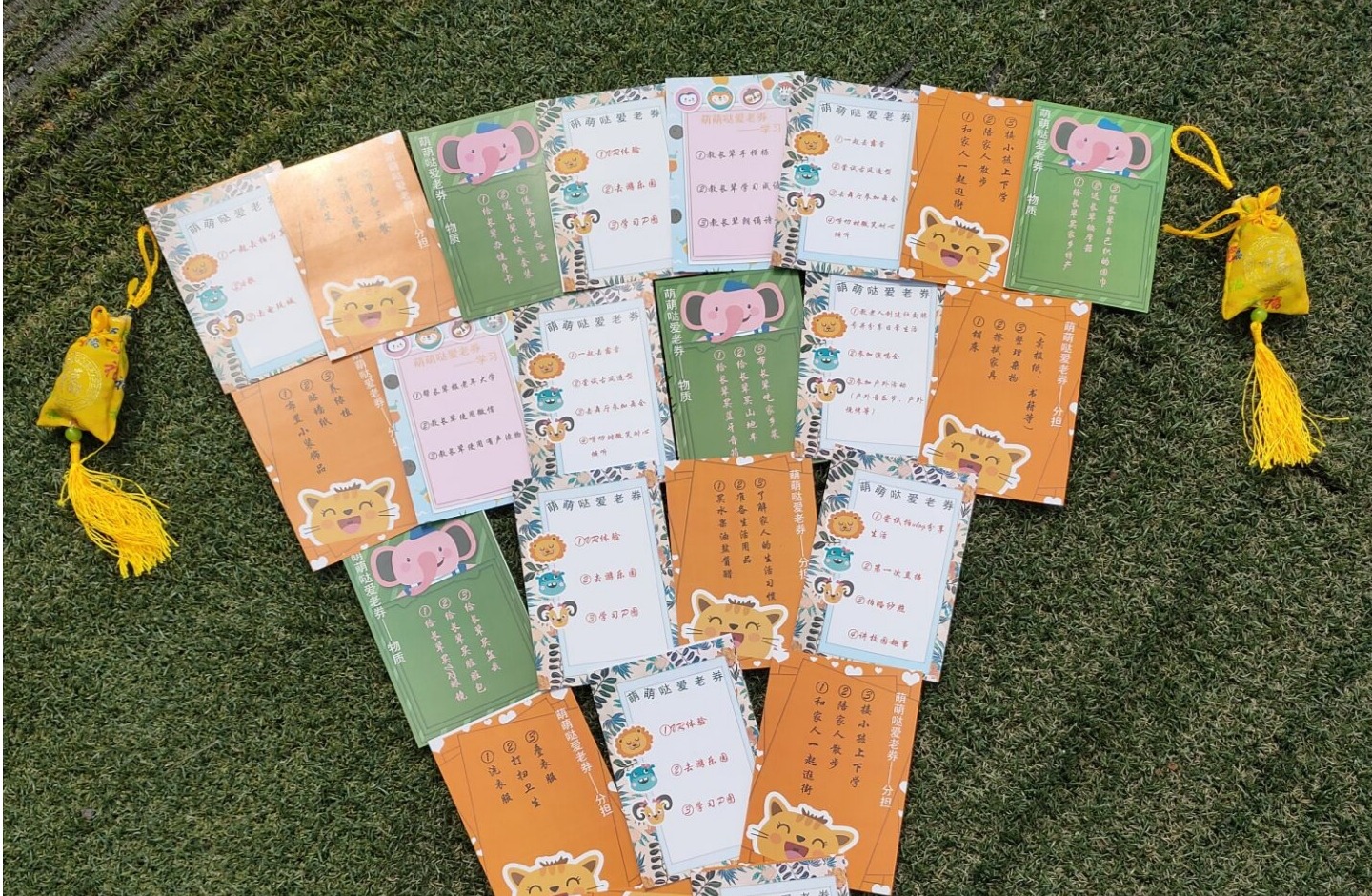 “萌萌哒爱老券”萌中带甜,包括物质、分担、学习、体验四个主题。爱老券上有近百项内容,物质类的有带长辈品尝脏脏包、火鸡面等网红食品,给长辈买山地车、VR眼镜或kindle,送长辈自己织的围巾;分担类的有帮长辈洗衣服、打扫卫生、贴墙纸、买菜做饭;学习方面内容十分丰富,有教长辈使用支付宝、微信、有声读物、智能音箱,教老人手指操,帮长辈报乐器班、国画班等;体验类的有和长辈跳广场舞、玩抓娃娃机,一起去拍写真,一起去游乐园,一起去旅行,一起尝试拍vlog分享生活、直播,唠叨时微笑耐心倾听,给老人讲故事,牵着长辈的手一起散步……丰富多彩体贴暖心的卡券内容向长辈表达着浓浓的爱意和温情。