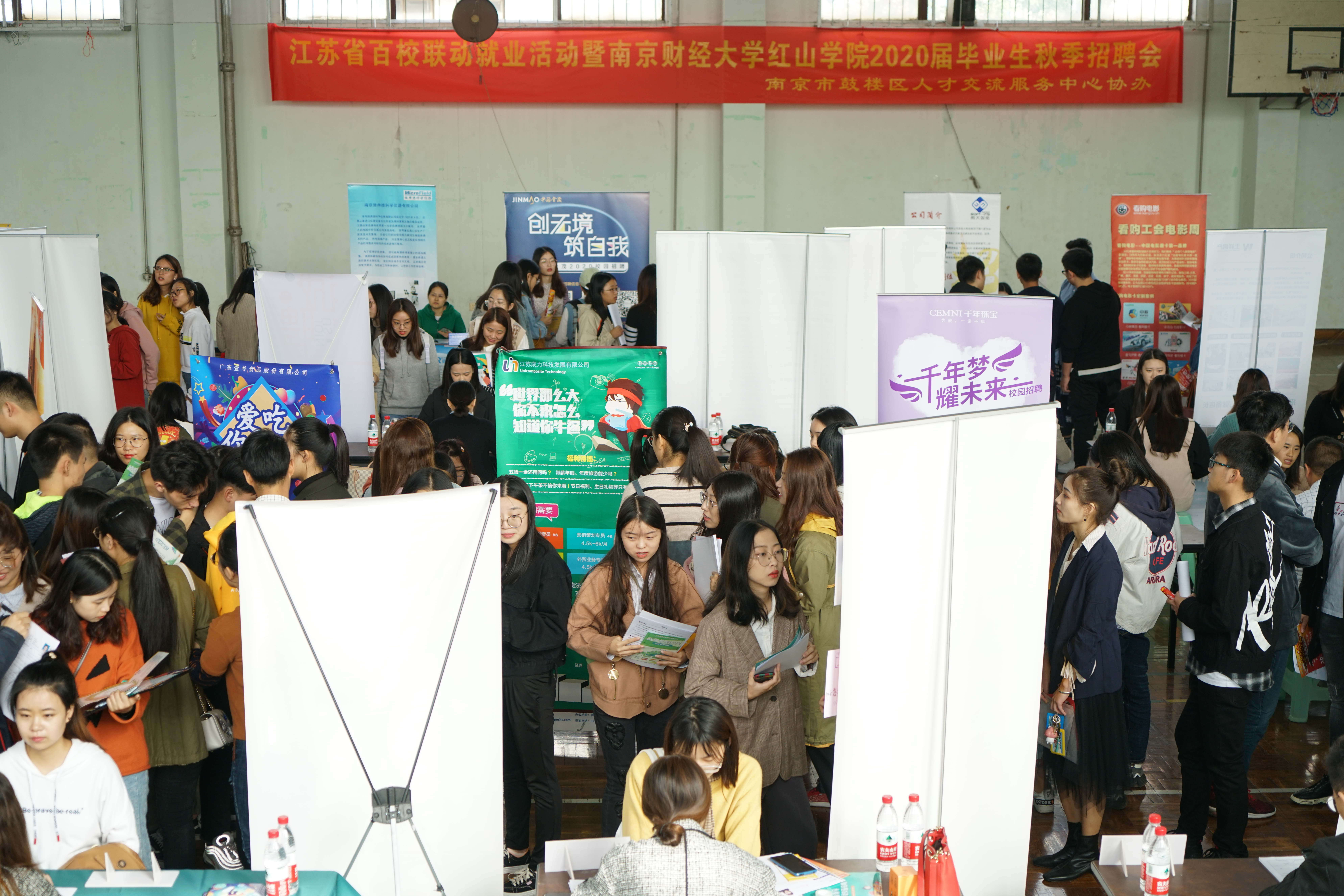 10月30日上午,江苏省百校联动就业活动暨bat365官方网站红山学院2020届毕业生秋季招聘会在bat365福建路校区体育馆举行。途牛信息科技、招商银行南京分行、南京苏宁云财信息技术有限公司、浙商证券、南京万得资讯等近百家用人单位现场招聘,涉及金融、财会、销售、管理等多个岗位,基本涵盖红山学院全部专业。