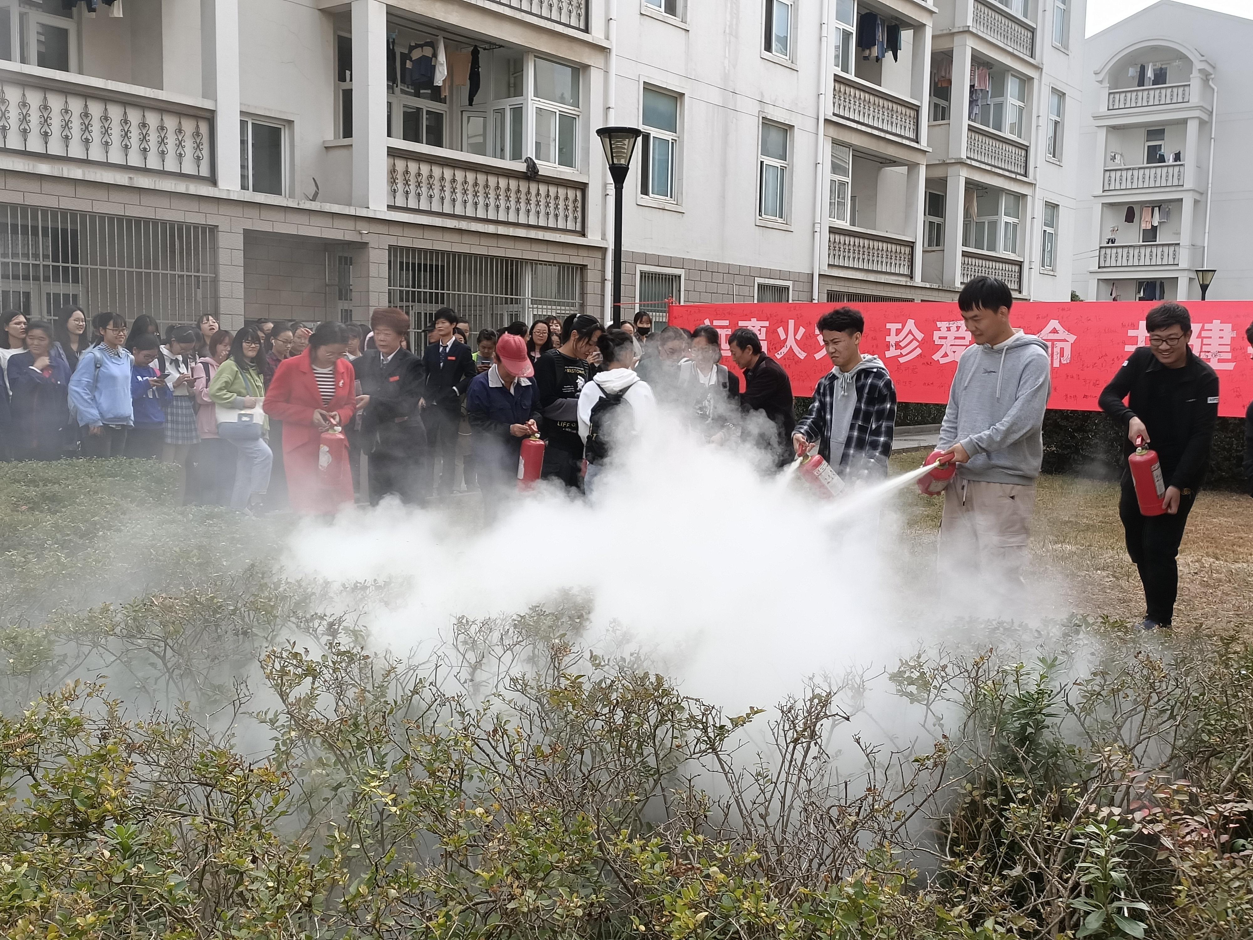 活动现场贴满了各式各样的宣传海报,用以宣传安全与消防知识。宿管站草坪中央拉起横幅——“远离火灾,珍爱生命,共建平安校园”,同学们纷纷在宣传横幅上签名留言。横幅前放置了灭火器,参加活动的同学和清洁工阿姨在工作人员的指导下学习如何正确使用灭火器、掌握最有效的灭火方法。同学们被安排进入宿舍楼道,与此同时,工作人员在楼道口燃放烟雾弹模拟火灾现场,引导同学们有序逃生。活动期间,宿管阿姨们始终坚守岗位,热心回答同学们提出的问题,并维持现场秩序。