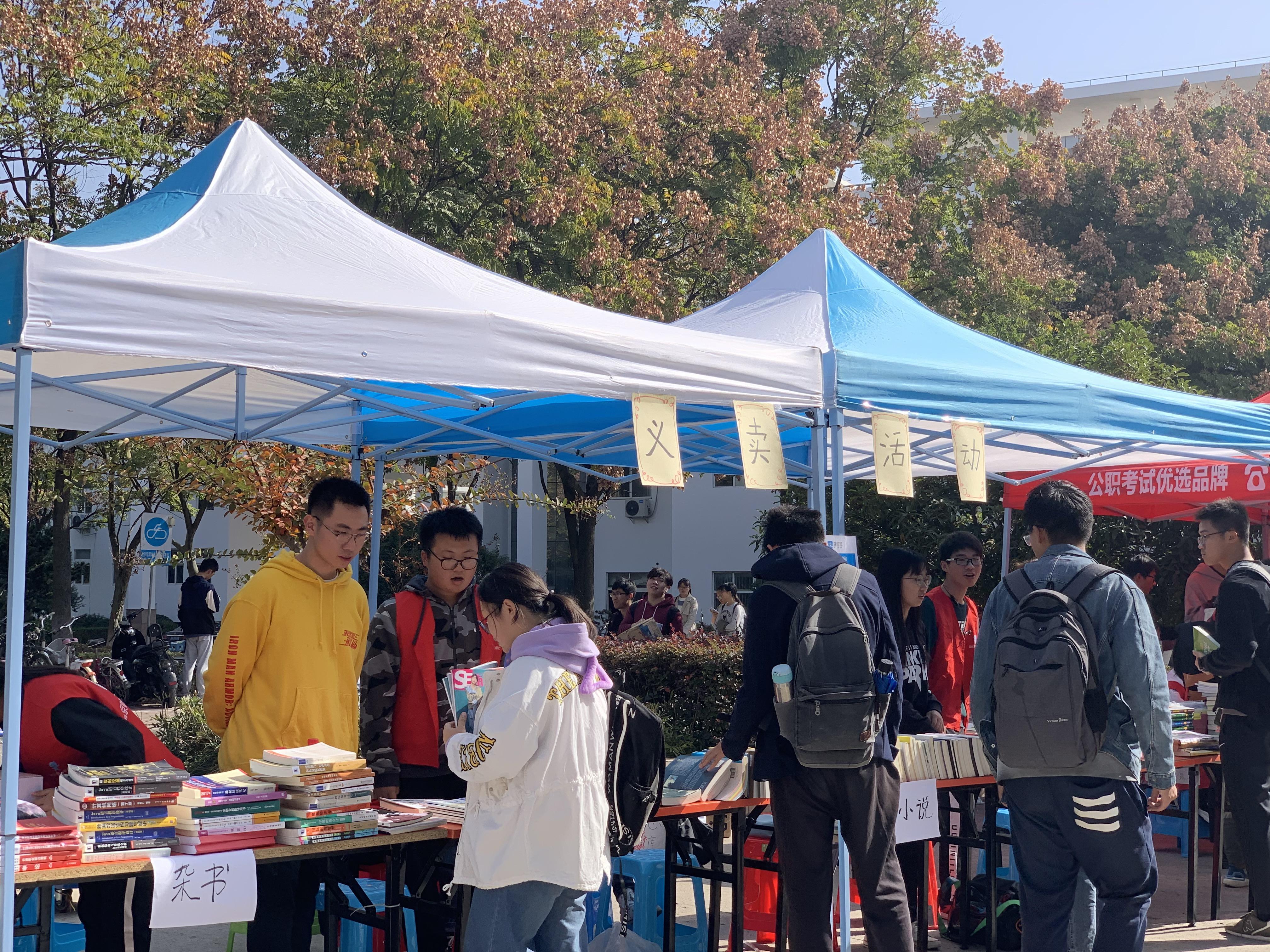 11月11日中午,由校青年志愿者协会主办的书籍义卖活动在仙林校区中苑食堂前广场火热进行。此次活动以“旧书义卖,新书寄爱”为主题,倡议同学们参与活动,帮助山区儿童丰富精神文化生活。不少同学驻足参与,购得书籍的同时,也献上了自己的一份爱心。