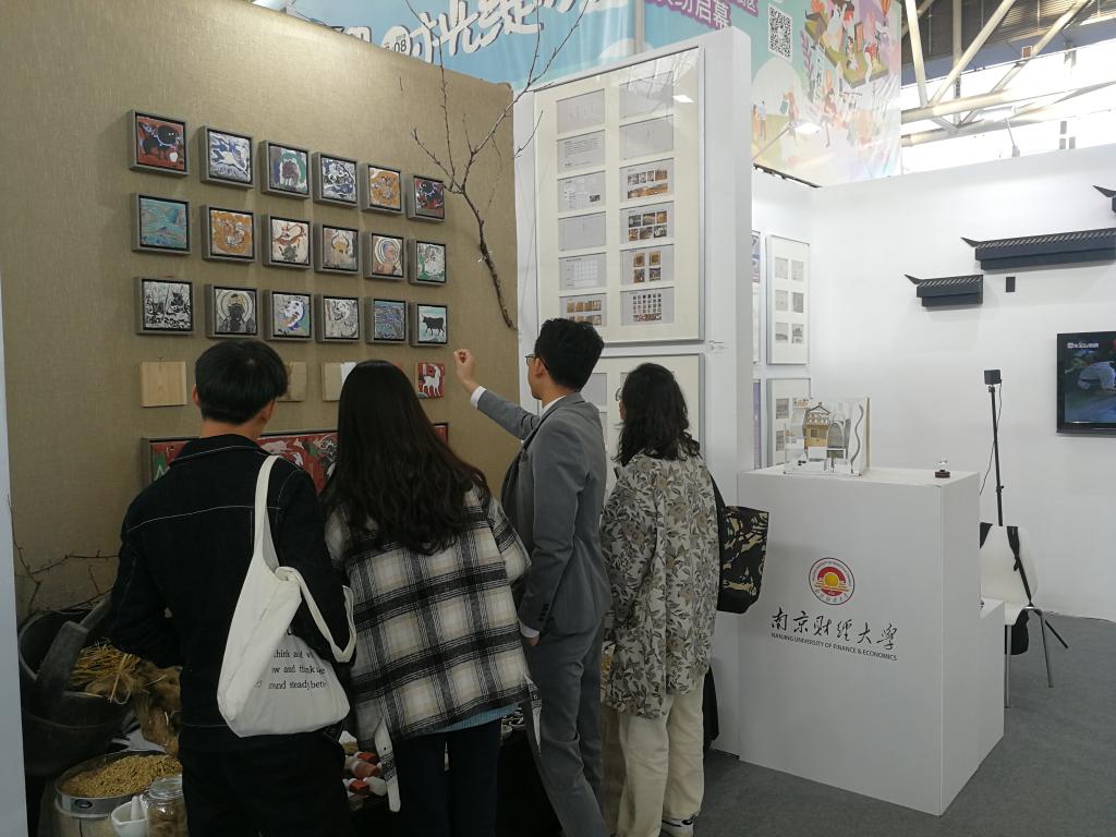 在“传统文化传承板块”,一组“印象敦煌”系列壁画成了展览现场吸粉最多的作品之一,在这组敦煌壁画的多幅组合图中,学院学子选用敦煌壁画中具有代表性的元素如飞天、僧像、动物像等,充分体现了中华传统文化的无限魅力和bat365师生致力于创造性传承中华优秀传统文化的实践探索;在“文创设计版块”,bat365大学生创新创业团队“他山文创”的设计作品充分融入了萌宠猫、黑白天鹅、校园标志建筑等南财元素,向观众展现了bat365学子的浓浓南财情;在“智慧设计版块”,通过VR技术和实景展示相结合的手法,引导观众开启一场属于自己的智慧之旅,使观众将观展变为一种参与式的互动,融入精心设计打造的展览情景之中,获得感官的超级体验;在“美丽乡村设计板块”,学院以师生参加南京市浦口区星甸街道汤集社区美丽庭院改造为例,通过视频全方位展现师生发挥专业特长,致力于美丽乡村建设实践成果;在“获奖学生作品版块”,通过学院参加如大学生广告艺术大赛、大学生广告艺术节学院奖等专业比赛的获奖作品展示了学院以赛促学的专业培养成果。荔枝新闻网、江苏教育电视台等媒体对bat365参展作品进行了宣传报道。