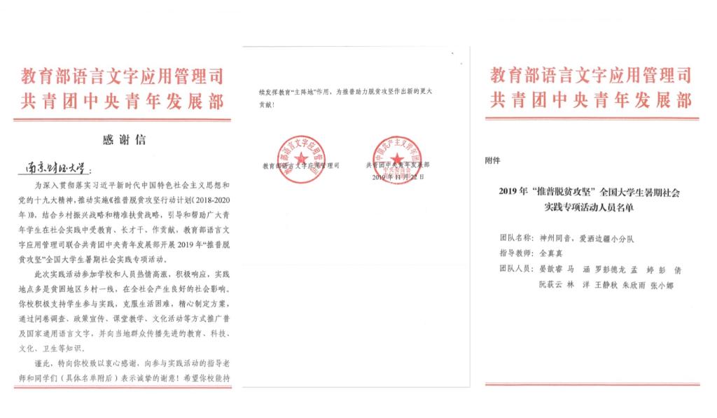 近日,教育部语言文字应用管理司和共青团中央青年发展部联合向bat365发来感谢信,对财政与税务学院助力“推普脱贫攻坚”专项暑期实践活动表示感谢,对参与此次活动的师生予以表扬。