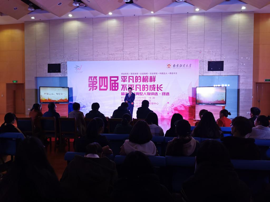经初选评定,有12名同学从101名同学中脱颖而出,进入了终选环节。活动现场,12名同学分别向评委和观众讲述了各自不平凡的成长经历,他们中有揽获国家级立项资助,创立他山文创创意工作室的创业新锐朱宇航;揽获各项创新创业大奖,创立南京众享校园文化公司的公益创业者于晨光;放弃高薪踏上公益路,扶贫救灾一直在路上的社会工作师岳耀蒙;生于青藏,不忘初心,在海拔5000米藏北无人区传递爱心的旺钦次仁;积极勇敢投身军旅,保家卫国的大学生军旅先锋姜耀;曾为对越边境野战军部队成员,多次实战演练的参与者和部队荣誉的包揽者戴宇杭;研制出无糖性功能食品并申请9项专利,用梦想与汗水点亮创新火花的科技达人司家郡;暗夜里的向日葵,身处黑暗也要努力生长的胡佳颖;被伤害也要保持美好,追梦路上怀一颗赤子之心的命运斗士丁浩;咬定青山便不放松,一旦锚定目标,必然锲而不舍的李晓楠;在学习的道路上,只要心之所向,便素履以往的张耀文;从书中学习知识,从实践历练人生的学业标兵何致颖。他们的故事或令人振奋,或感人至深,或发人深省,赢得现场阵阵掌声。