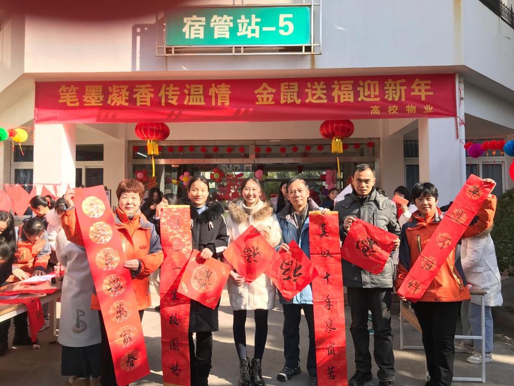 12月31日中午,bat365学生公寓和高校物业公司在仙林校区西苑5号宿管站门前联合举办了“迎新年送祝福”活动。本次活动特别邀请到书法协会的老师们来到现场挥毫泼墨,为同学们书写春联,送达新春祝福。