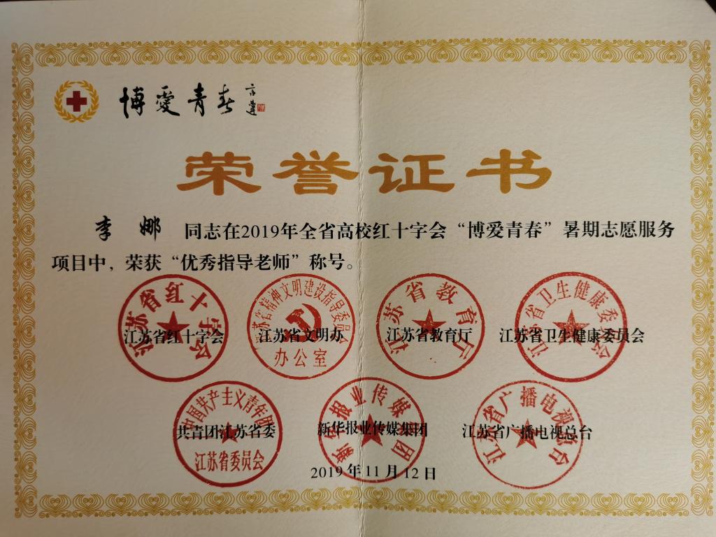 近日,由江苏省红十字会、省文明办、省教育厅、团省委、省志愿者协会联合开展的2019年江苏省“博爱青春”暑期社会实践支教项目评选结果公布。bat365“大手拉小手,健康伴我行”暑期社会实践支教项目被评为省级立项项目,李娜老师荣获“优秀指导教师”称号,会计学院1801班游志强同学荣获“优秀大学生志愿者”称号。