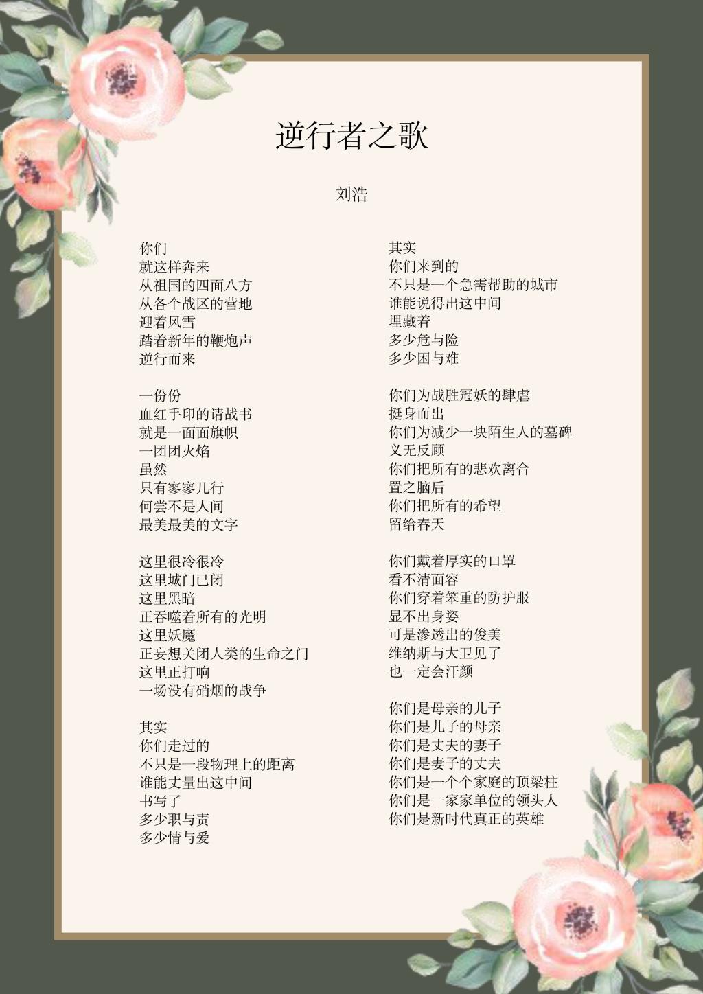 学院党委书记刘浩感动于“逆行者”的无私奉献,创作原创诗歌《逆行者之歌》,歌颂他们不畏艰险、为大爱舍弃小爱的无私精神,传递社会正能量。