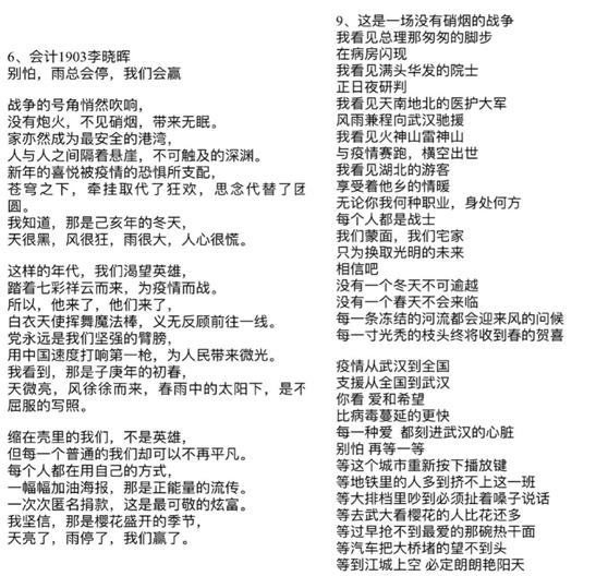 网络集结,传递温暖正能量。为阻断疫情向校园蔓延,需要提高师生的防范意识,确保开学之后学生们的健康安全,会计学院号召同学们设计海报、创作诗歌,提高自身意识的同时为英雄加油、为时代讴歌,在防控的关键时期生产“精神疫苗”。短短几天,同学们制作了27张海报、17首诗歌,制作了很多手势舞。
