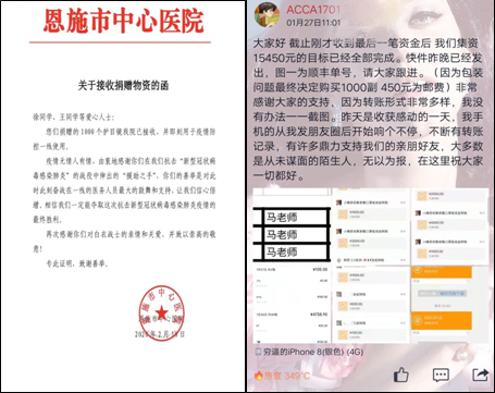 募捐抗“疫”,为一线安全护航。ACCA1701班的王同学一直关注疫情,看到湖北医护人员防护物资短缺却依旧需要战斗在一线的新闻,就一直思考自己可以做些什么。起初她委托在墨尔本读书的徐同学联系当地货源并希望将其转运回国,但当时湖北是否接受境外捐助并不明确,于是两人便又联系了丹阳的同学寻找到一家护目镜厂家,随后又与湖北恩施市中心医院核实相关信息和需求后,在朋友圈发起了集资活动,购买了三箱共一千副护目镜,并于1月31日送达湖北恩施市中心医院。她说,“通过在朋友圈号召,很多同学都积极捐款,心系湖北,这些善举,体现了大爱之心和守望相助的高尚情怀,也展示了南财人的精神风貌。”