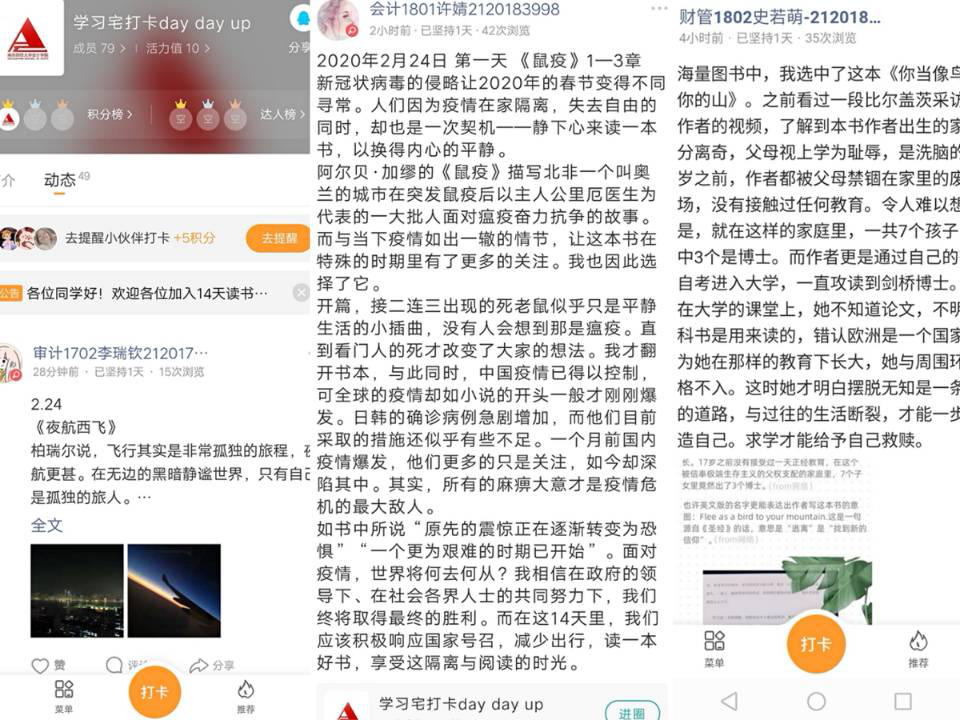 会计1801班许婧同学在读完法国作家加缪的《鼠疫》后,联系抗疫现状,深刻地认识到“所有的麻痹大意才是疫情危机的最大敌人”,呼吁人们提高防范意识,响应国家号召减少出行;资产1701班王梦小雪同学阅读社会学家阿伦森《社会性动物》片段后,指出“人是社会性动物,最典型的行为便是从众”,结合网络世界中的网络暴力现象,告诫青年人要“保持独立思考能力,谨慎发言”;审计1702班李瑞钦同学在阅读英国女飞行员柏瑞尔·马卡姆创作的回忆录《夜航西飞》之后,悟出了“孤独是富有创造力的”,她说道:“这场疫情给我带来自我封闭、思考的时间,我利用这段时间通过阅读汲取了养分。”