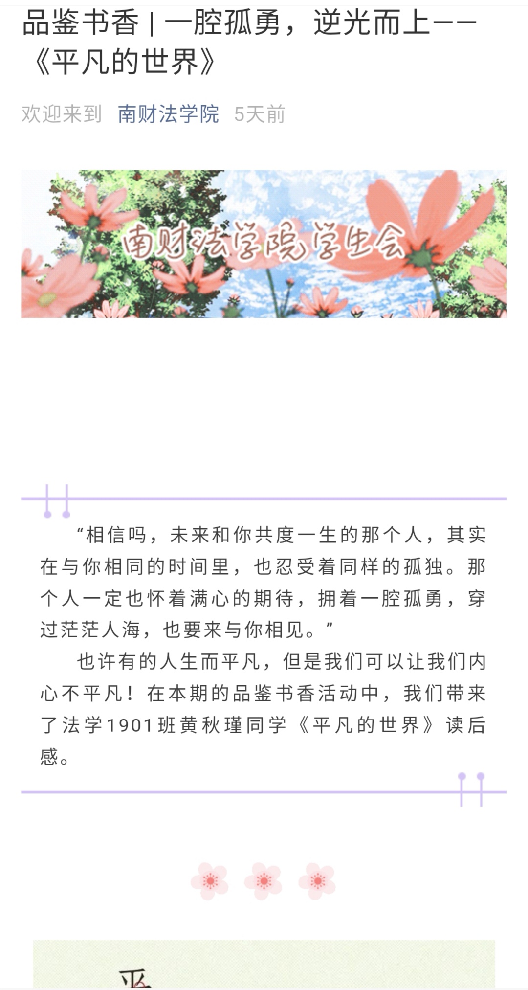 陈逸同学分享了季羡林先生《老猫》的读后感,从小事物引发大情感的思考,由“猫护犊子”联想到母亲倾注的情感,发出了“最亲近的人也是最习惯忽略的人”的感慨,呼吁大家多多关注自己身边的人;黄秋瑾同学在读完路遥先生的《平凡的世界》后,体会了“苦难”的深层内涵,感悟到“也许人生而平凡,但是我们可以让自己的内心不平凡”,期望大家都能够“在属于自己的季节里努力綻放,释放花香”;黄子潇同学在《孟子》中感悟到儒士胸怀的仁义梦,感受到“正是每一位华夏子孙的付出,才构成中华文化漫长而辉煌的篇章”;缪王达同学在马克斯·韦伯《新教伦理与资本主义精神》一书中感受到时代的精神,结合当下疫情中“逆行者”的职业操守与奉献精神,深刻体会到对人类命运普遍关怀的人文精神的重要性。
