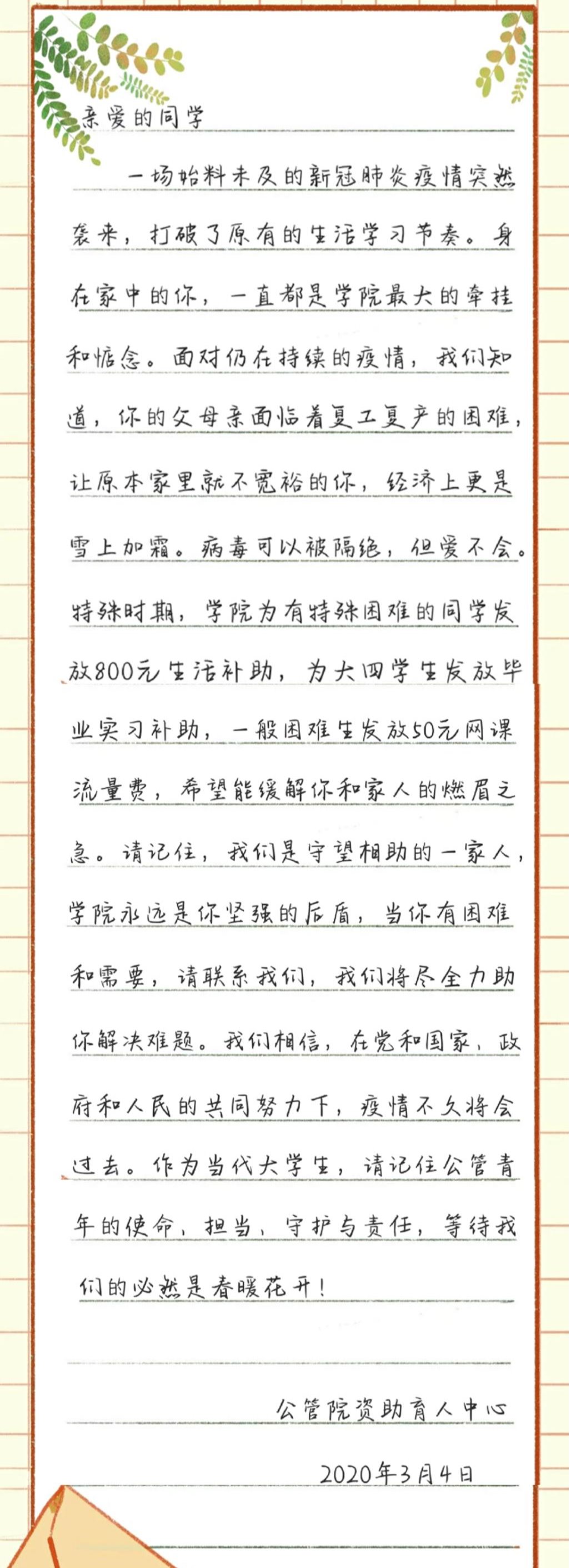 公共管理学院同时也为受资助同学送去了慰问信,学院将持续关注每一位家庭经济困难学生,将资助工作做实做细。