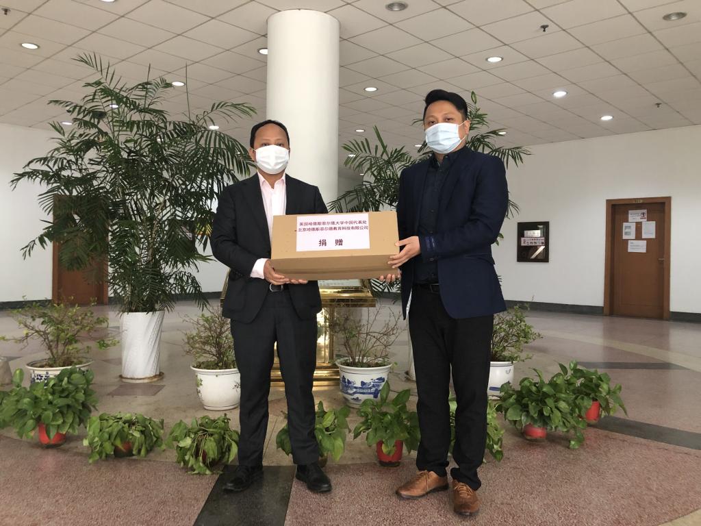 2月25日,英国哈德斯菲尔德大学中方招生负责人魏勇翔到访福建路校区,将哈德斯菲尔德大学捐赠的一批医用口罩送达红山学院。红山学院党委副书记、纪委书记高永东代表学院接受捐赠。