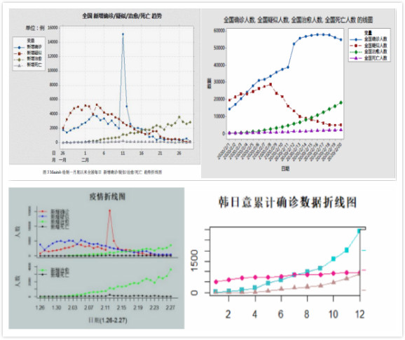 活动中,同学们认真收集资料,查阅数据,绘制图表,分析并预测趋势。有的同学统计一月底以来全国新增确诊、疑似、死亡、治愈人数趋势,指出此次疫情已经由最初的迅猛发展并大范围蔓延,转变为当下的逐渐减弱,并继续向好发展,战疫胜利已经看到了曙光。有的同学分析二月初以来安徽一省现存确诊人数趋势,指出通过政府的有效控制和全省人民的积极配合,安徽省新冠肺炎患者在二月中旬增长至顶峰后开始逐渐下降,有望于3月中旬使新冠肺炎患者数归零。有的同学统计韩国、日本、意大利三国累计确诊人数变化趋势,指出周边国家疫情状况日益严重,为我国彻底打赢疫情战带来新的挑战,我国应密切关注境外新冠肺炎病毒的输入。