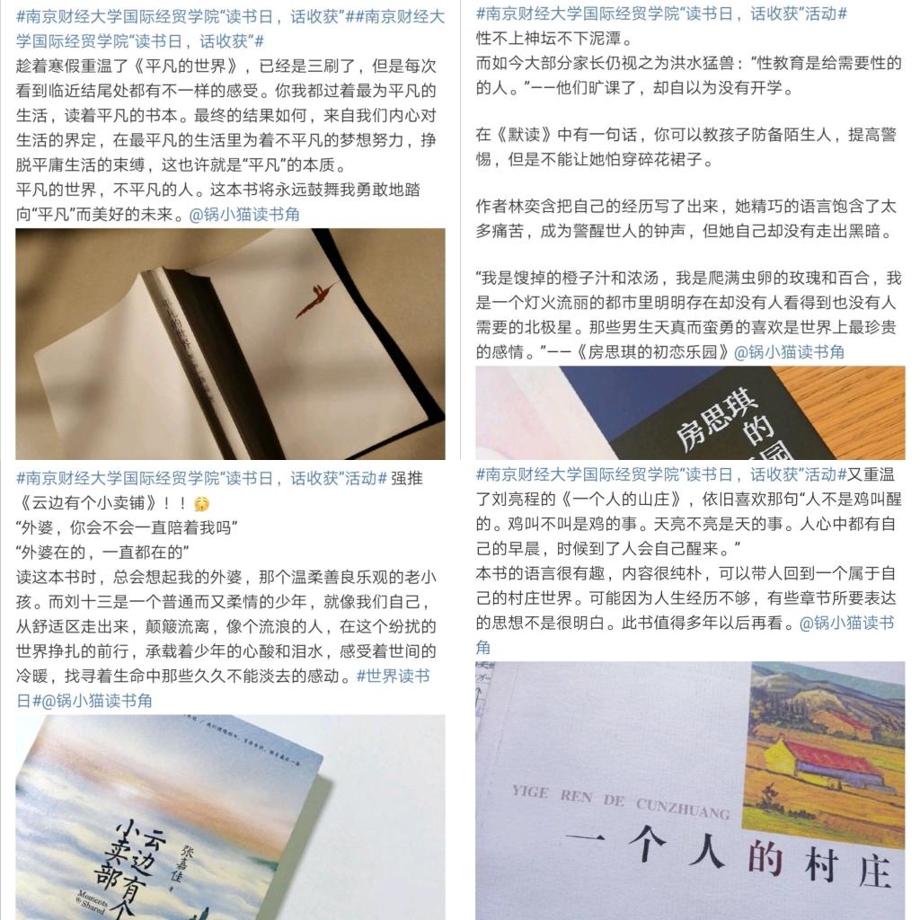 管理科学与工程学院以话题讨论的形式开启了一场“超时空对话”。参与者可以在学院微博发起的两个话题#世界读书日,超时空对话#以及#晒最美春天,品最暖书香#下打卡,分享自己最喜欢或者最想向大众分享的一本书籍,分享自己对作者和书中角色的理解,分享自己的读书笔记和春天里的美丽景色。同学们积极响应,纷纷在微博话题下进行留言讨论。还有同学用照片分享了春日里的那一抹平淡与壮丽,晒出了最美的春天。经过线上投票,最终票选出三位大家认为最有感染力的阅读分享者,学院以快递形式将精美礼品送达。
