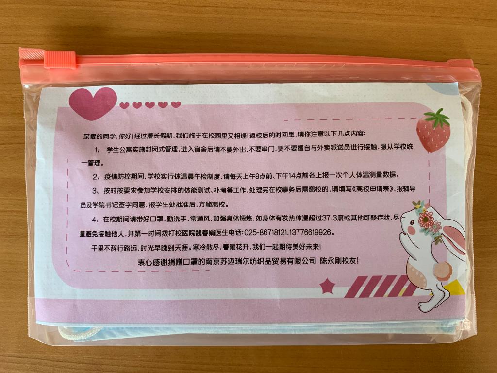 4月22日返校报到当天,43名返校学子均按“一测二核三查四领五交”要求,安全顺利到校报到。在报到现场,辅导员还为返校学子送上陈永刚校友捐赠的口罩小礼包,小礼包上附有老师们为学生准备的返校后学生管理注意事项的温馨提示。