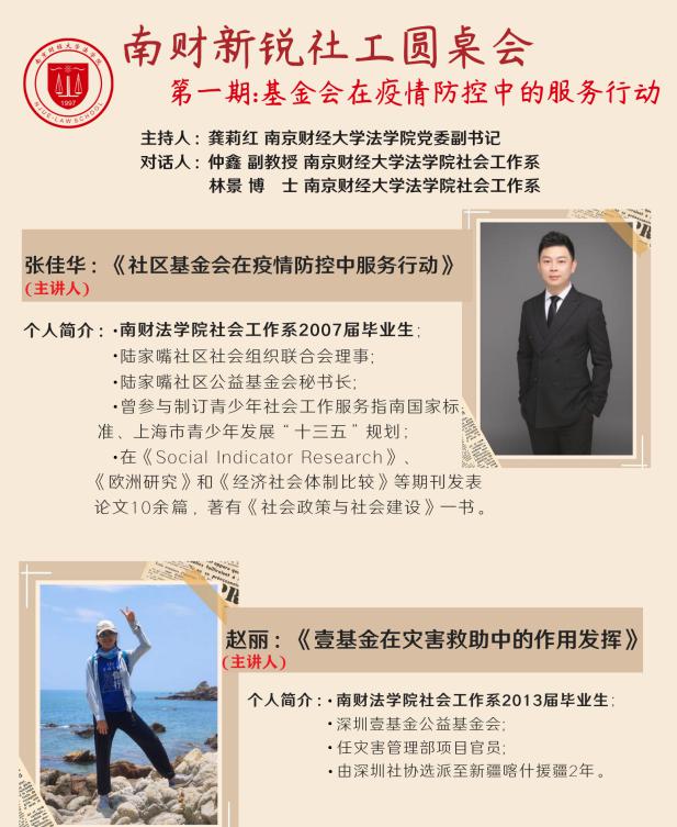 5月18日晚,系列活动的帷幕拉开。首期圆桌会由法学院党委副书记龚莉红主持,主讲嘉宾分别是社工系2007届毕业生、陆家嘴社区基金会秘书长张佳华和2013届毕业生、深圳壹基金基金会灾害部专管赵丽。他们分别就“社区基金会在疫情防控中的服务行动”与“讲演内容是壹基金在灾害救助中的作用发挥”的主题进行讲演。在圆桌会互动环节,本系副教授仲鑫、博士林景及江苏省社会工作者协会副秘书长李振鑫就社区基金会与基层组织在疫情防控中的联动合作机制以及社工参与基金会事业的能力建设等议题展开深入探讨。