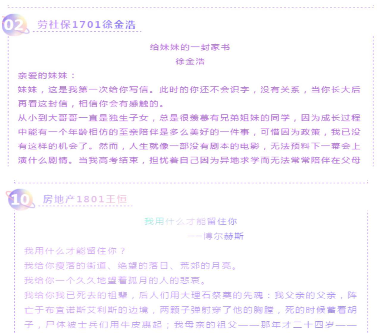 活动中,有的同学为自己可爱的妹妹书写并朗诵了一封真挚而温馨的家书,也有同学朗诵了自己珍藏的短诗。每一份投稿都饱含着同学们内心的温柔和感动,同学们也通过朗诵的作品将声音和文字的力量融合,来治愈自己、鼓励他人,将心中的情绪释放,将内心的爱意表达,以乐观积极的心态面对学习和生活。