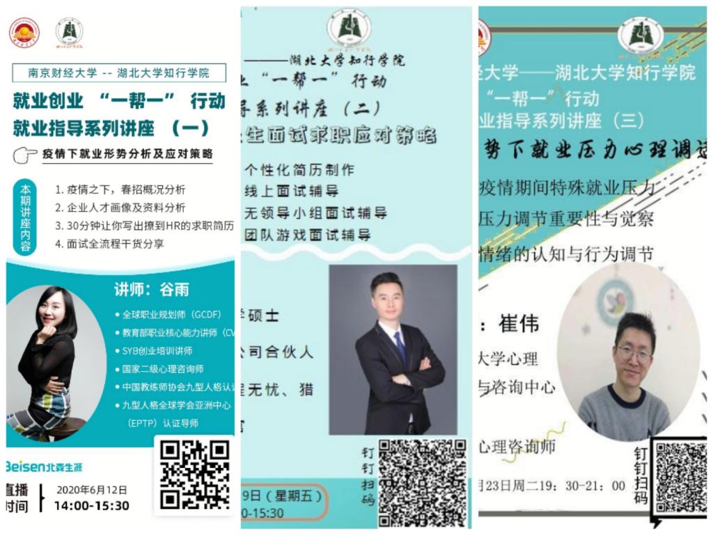 6月12日至23日,面向bat365官方网站和湖北大学知行学院2020届毕业生的系列就业指导讲座线上开讲,专业人才测评公司合伙人郭伟、北森生涯职业讲师谷雨、bat365心理咨询师崔伟分享了疫情形势下就业形势、求职简历与面试、心理压力与调试等内容,带领两校毕业生一起解读当下的就业形势,学习必要的面试技巧,提高毕业生疫情期间的就业意识和竞争力。1000多名学生聆听了讲座,并进行了线上咨询互动。