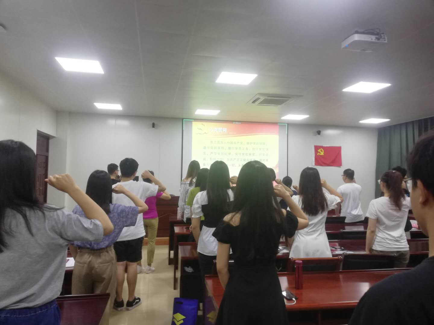 党课最后,全体党员在党旗下重温入党誓词。