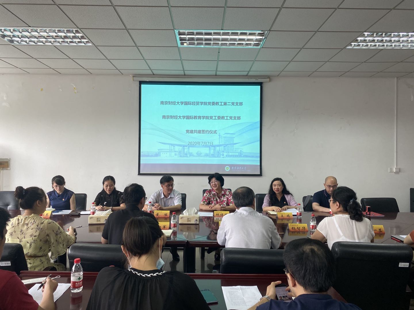 7月7日下午,国际经贸学院党委教工第二党支部与国际教育学院党工委教工党支部在仙林校区德经楼308会议室举行党支部结对共建签约仪式。校党委常委、副校长邱伟芬,国际经贸学院党委书记张阳军,国际经贸学院教工第二党支部书记、院长宣烨,国际教育学院党工委书记王娟、院长黄能以及各支部书记、党员代表参加会议。