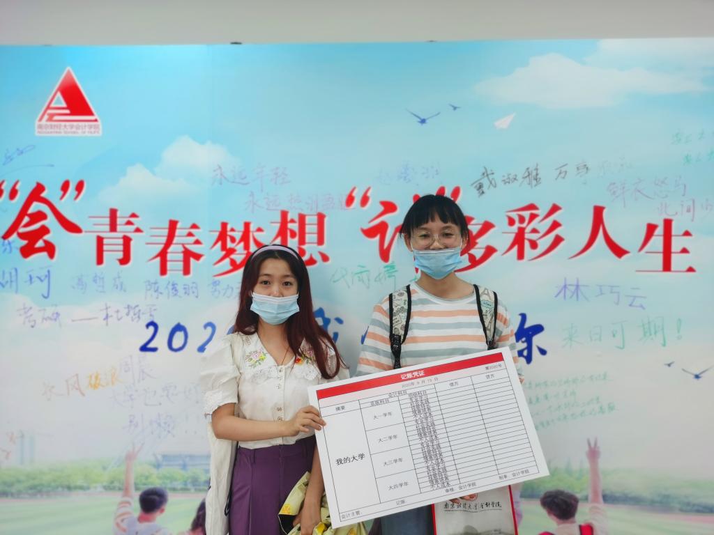 经济学院用2020级全体新生的名字组成的一句“绘经济愿景,启数据智慧”,既是对新生们的期许,也注定将会是他们的宏愿。报到现场,每位新生还认领了专属的“小经灵”卡通漫画贴,寓意着“经生经世,经院有你”。专业楼的绿草坪上,学院还设立了拍照打卡点,以学校为背景,框住每个你。不止如此,经济学院还为萌新们准备了心意满满的礼袋,入学日程安排表、学习用具、防疫物资……只等“小经灵”们前来领取这一份份沉甸甸的关爱。