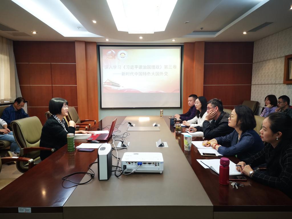 10月14日下午,校党委常委、副校长邱伟芬为国际合作与交流处及国际教育学院全体成员讲授“深入学习《习近平谈治国理政》第三卷——新时代中国特色大国外交”主题党课。