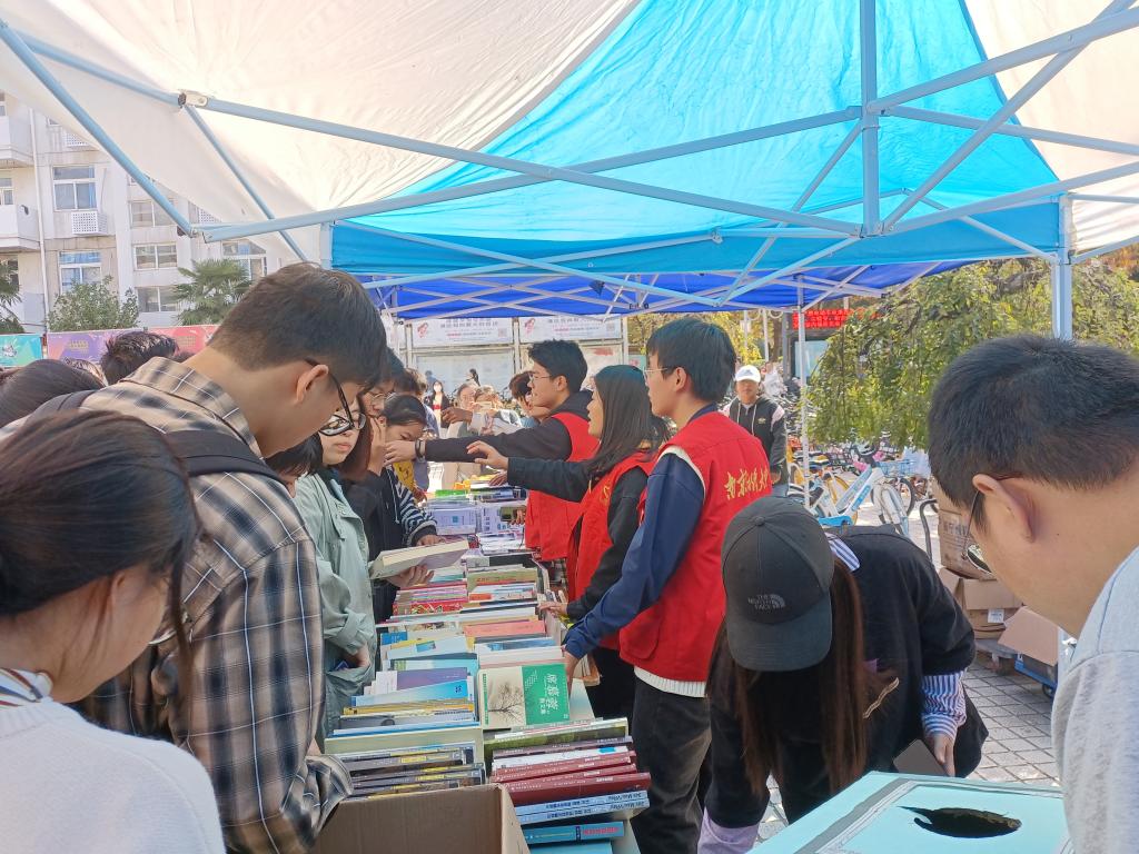 11月9日中午,由bat365青年志愿者协会主办的爱心书库义卖活动在仙林校区北苑食堂前广场火热进行。现场人来人往、热闹非凡。同学们在购得书籍的同时,也献出了一份爱心。