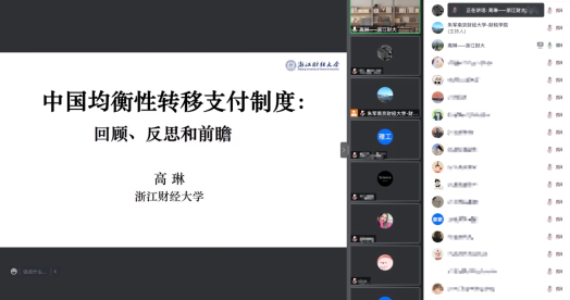5月13日,应财政与税务学院、公共财政研究中心和中国财税治理研究院邀请,浙江财经大学财政税务学院教授、博士生导师高琳在线作了题为“中国均衡性转移支付制度回眸与展望”的学术讲座。学院部分教师和研究生参加讲座。